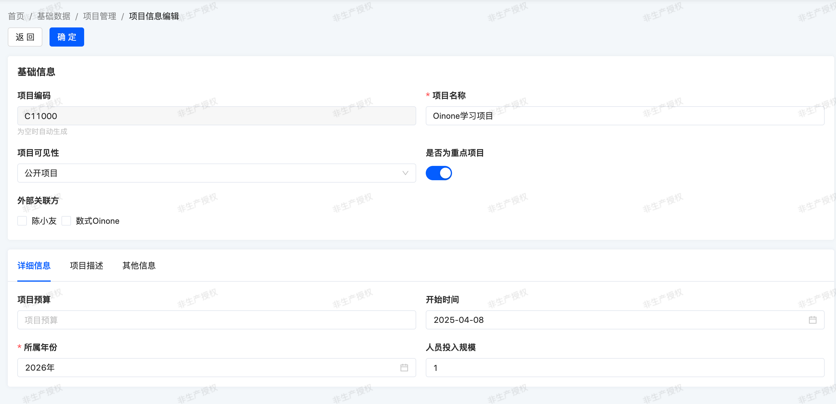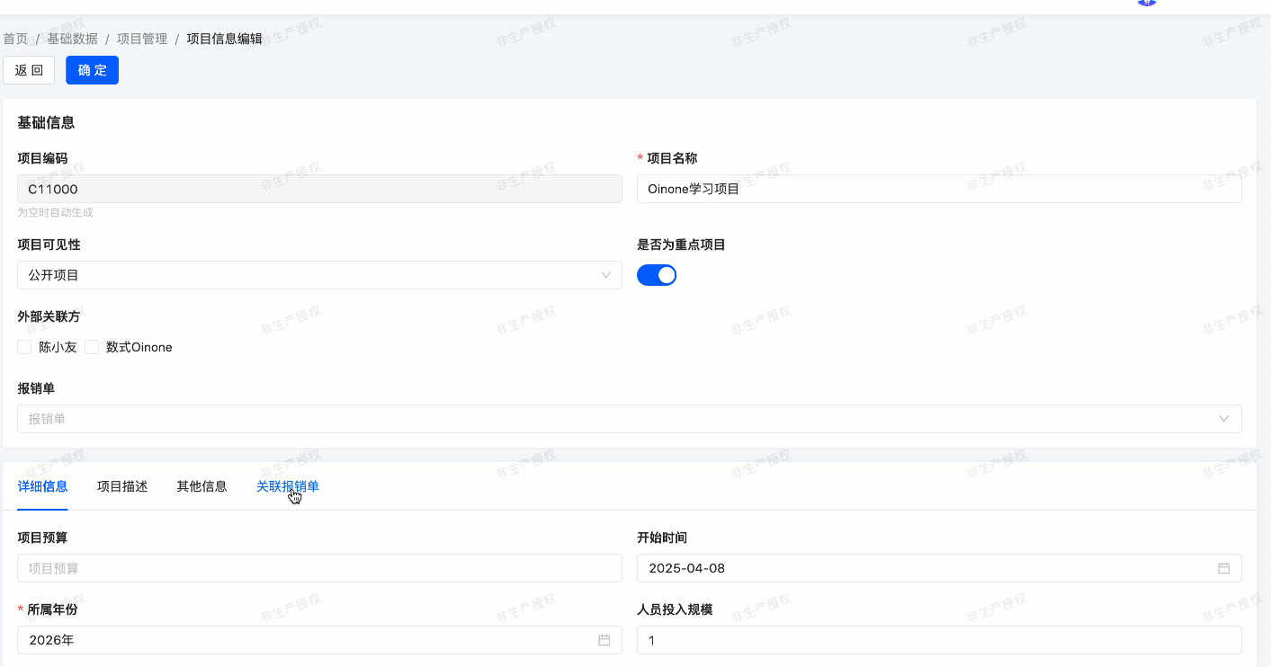 Second, although the projectInfoId field is not displayed, we add values to it in the view. How does Oinone know which project our expense bill is associated with? This is the beauty of using the Oinone framework: sometimes certain things are defined implicitly. When we create a record through a one-to-many (one2many) field, the corresponding many-to-one (many2one) field is automatically filled for convenience.