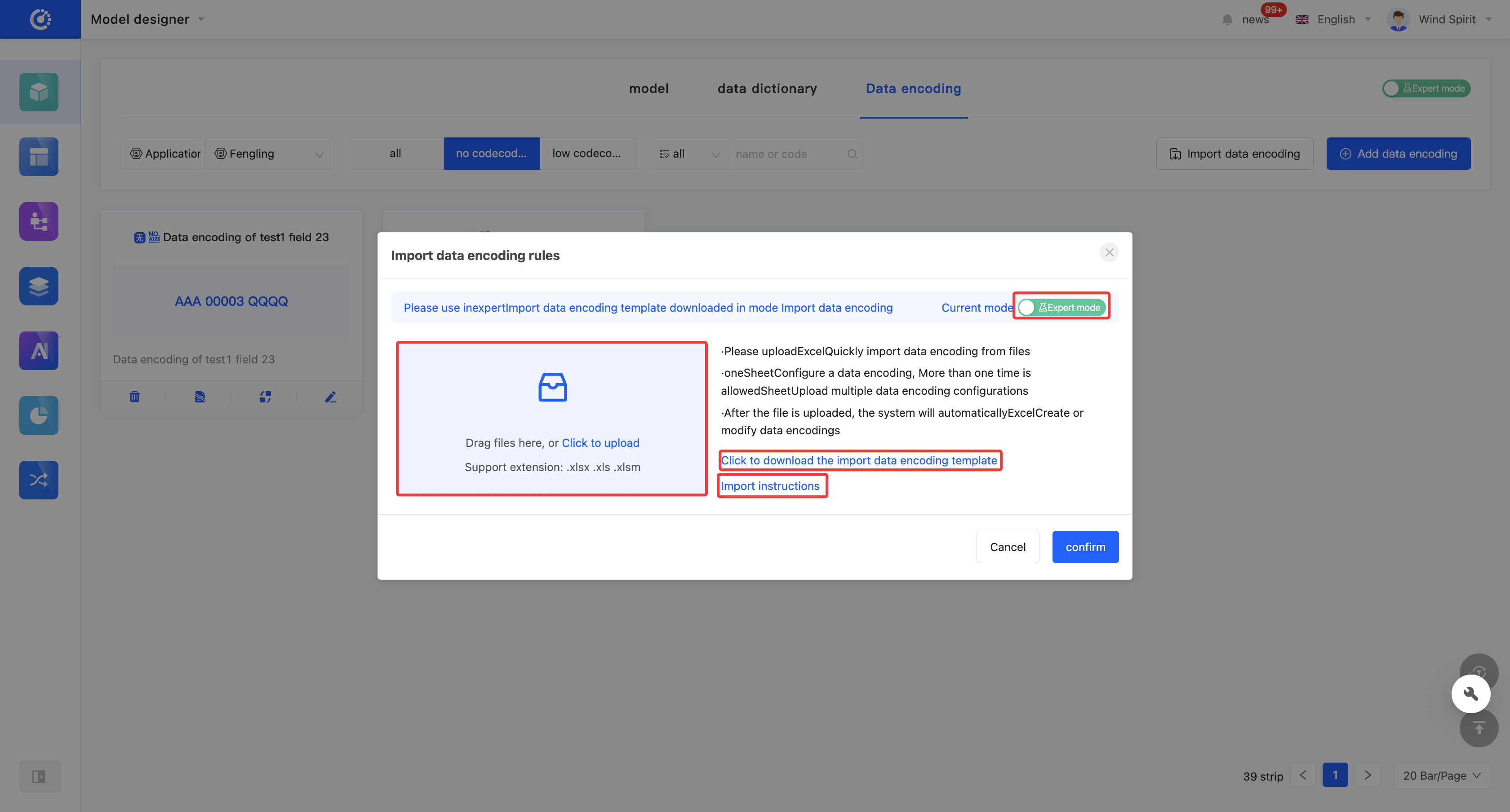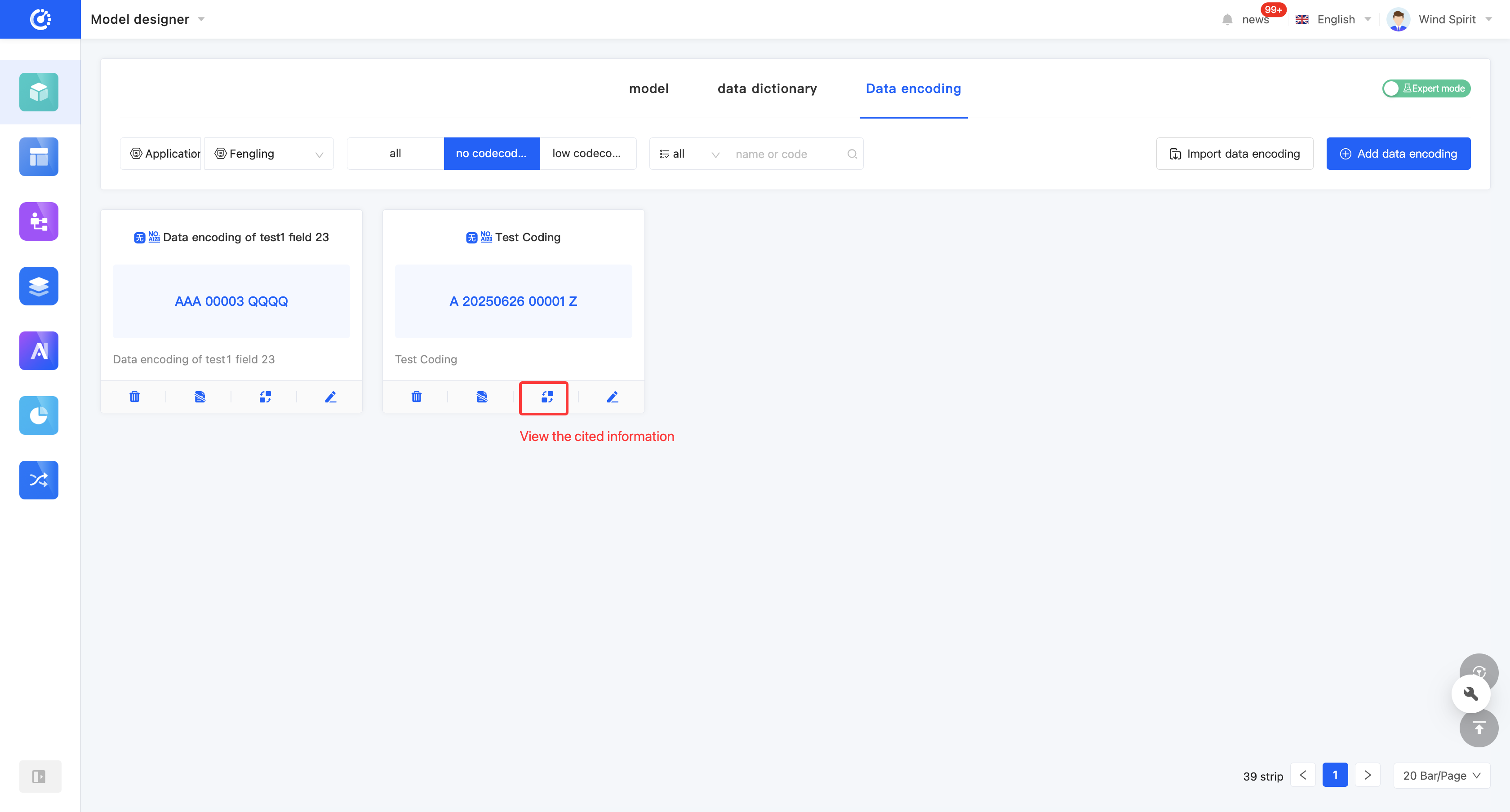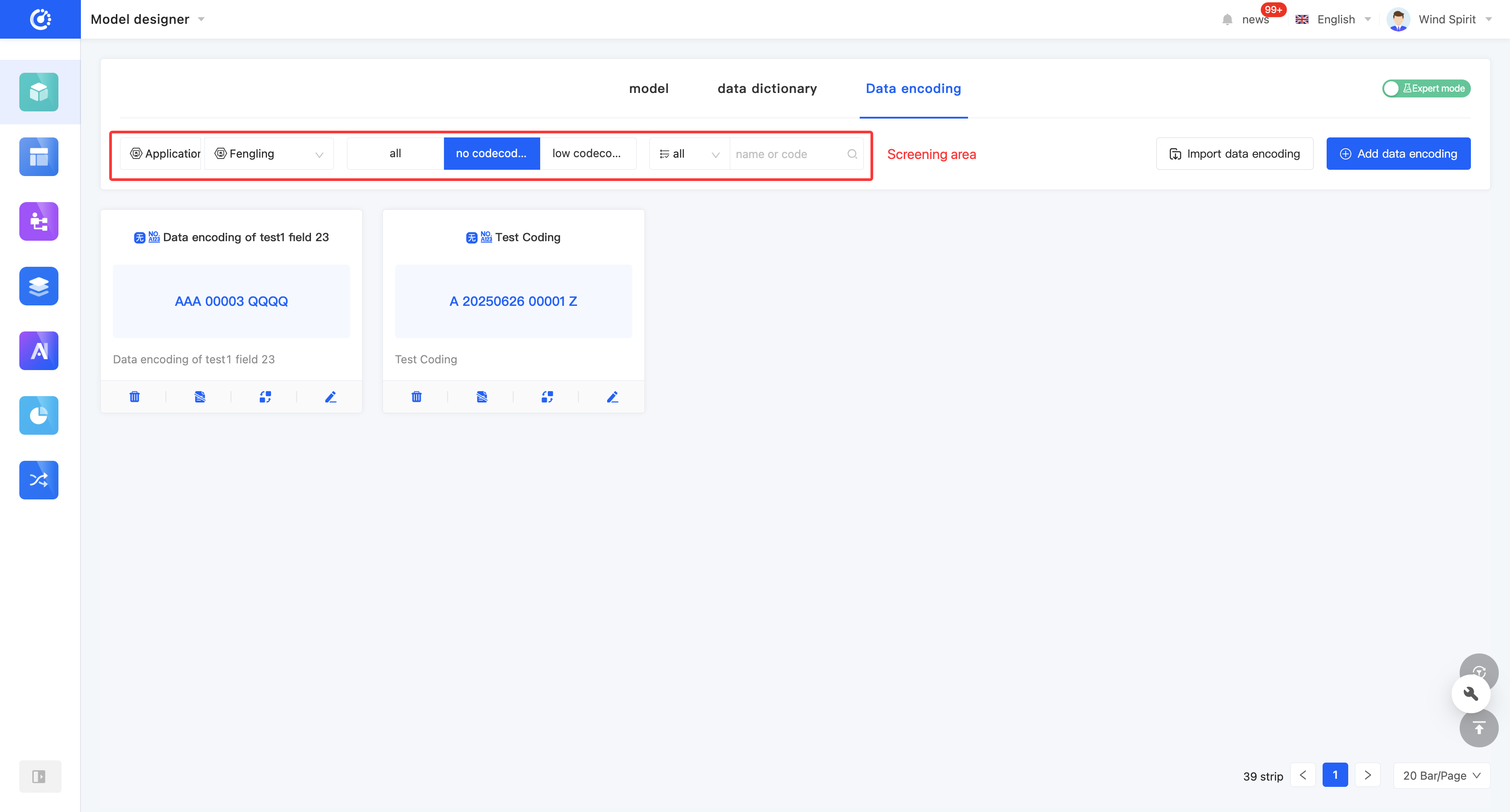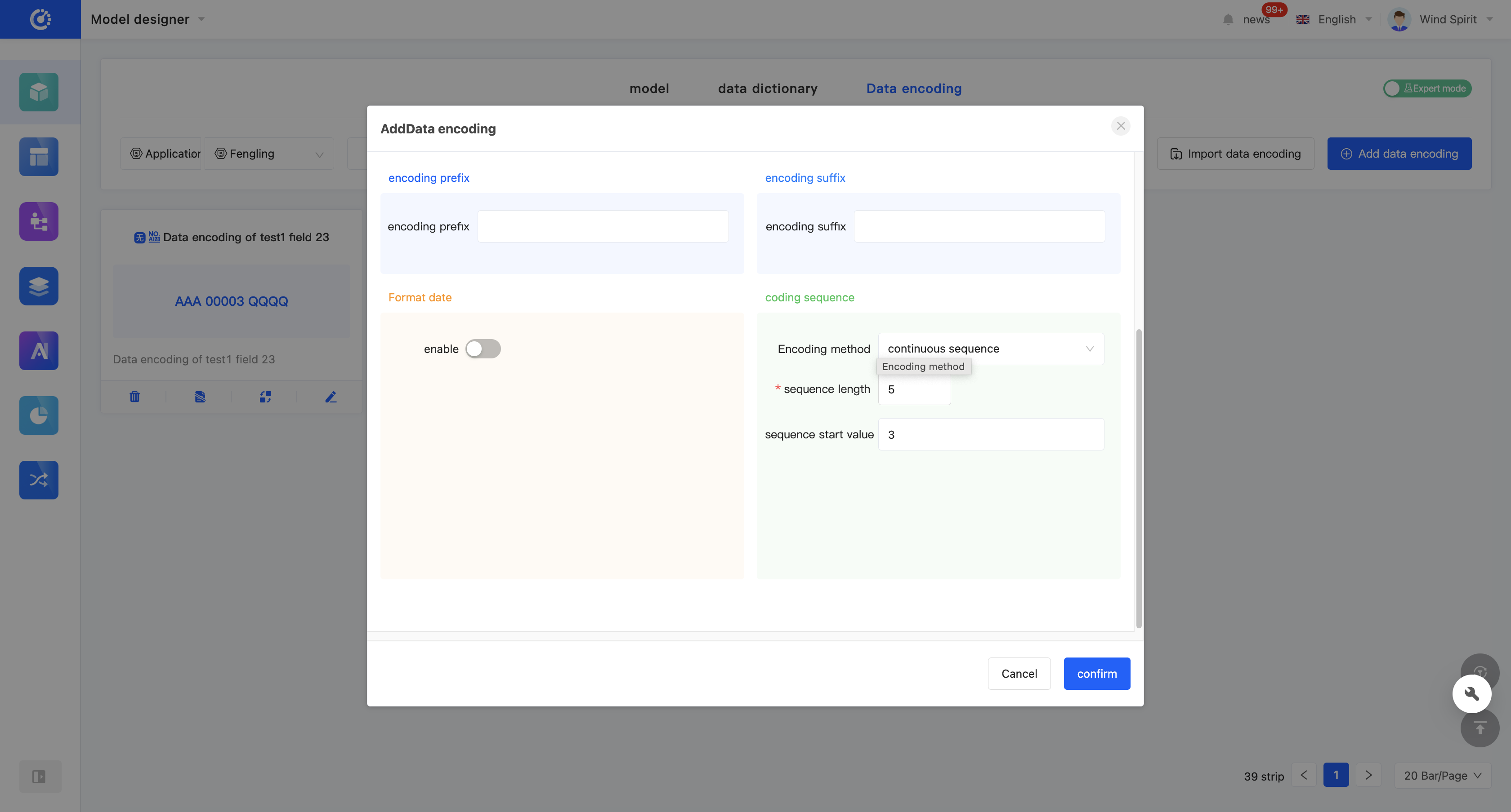 You can create no-code encoding through the Model Designer. When creating, you can edit information such as the encoding name, code name (only in the expert mode), encoding prefix/suffix, formatted date format, and encoding sequence.