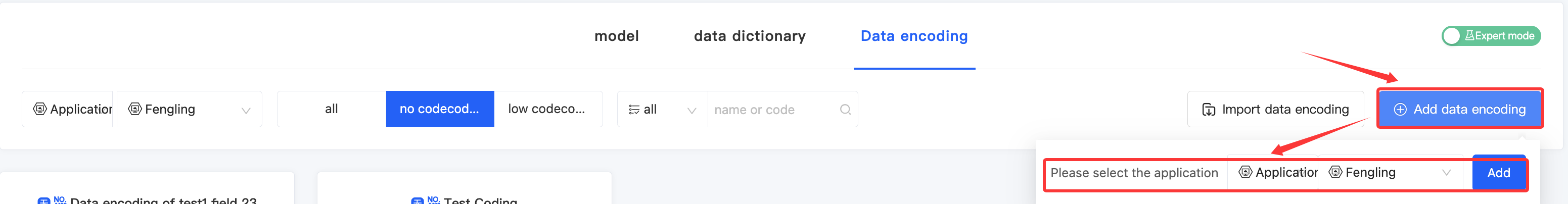 According to actual needs, select the application/module, data encoding type, or enter the name to customize the filtering conditions for precise filtering of data encoding. It supports clearing all filtering conditions with one click.