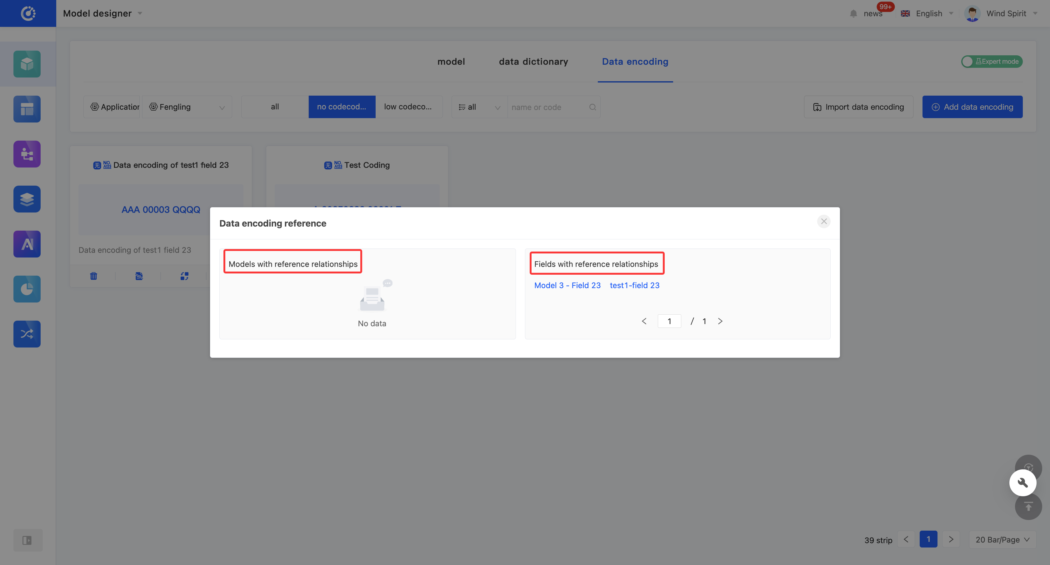 Through this function, you can view various elements that have reference relationships with the data encoding, including other models and fields. Each relationship is displayed in a list, and the list items are links that can lead to the corresponding design pages; the content is the corresponding content.