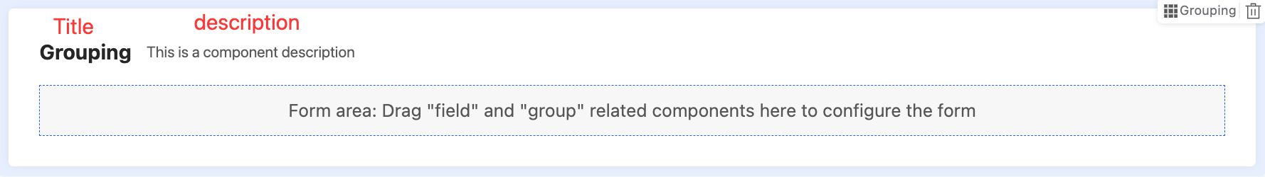 - Description: Used to describe the component information. The description of the grouping is on the left side of the title.