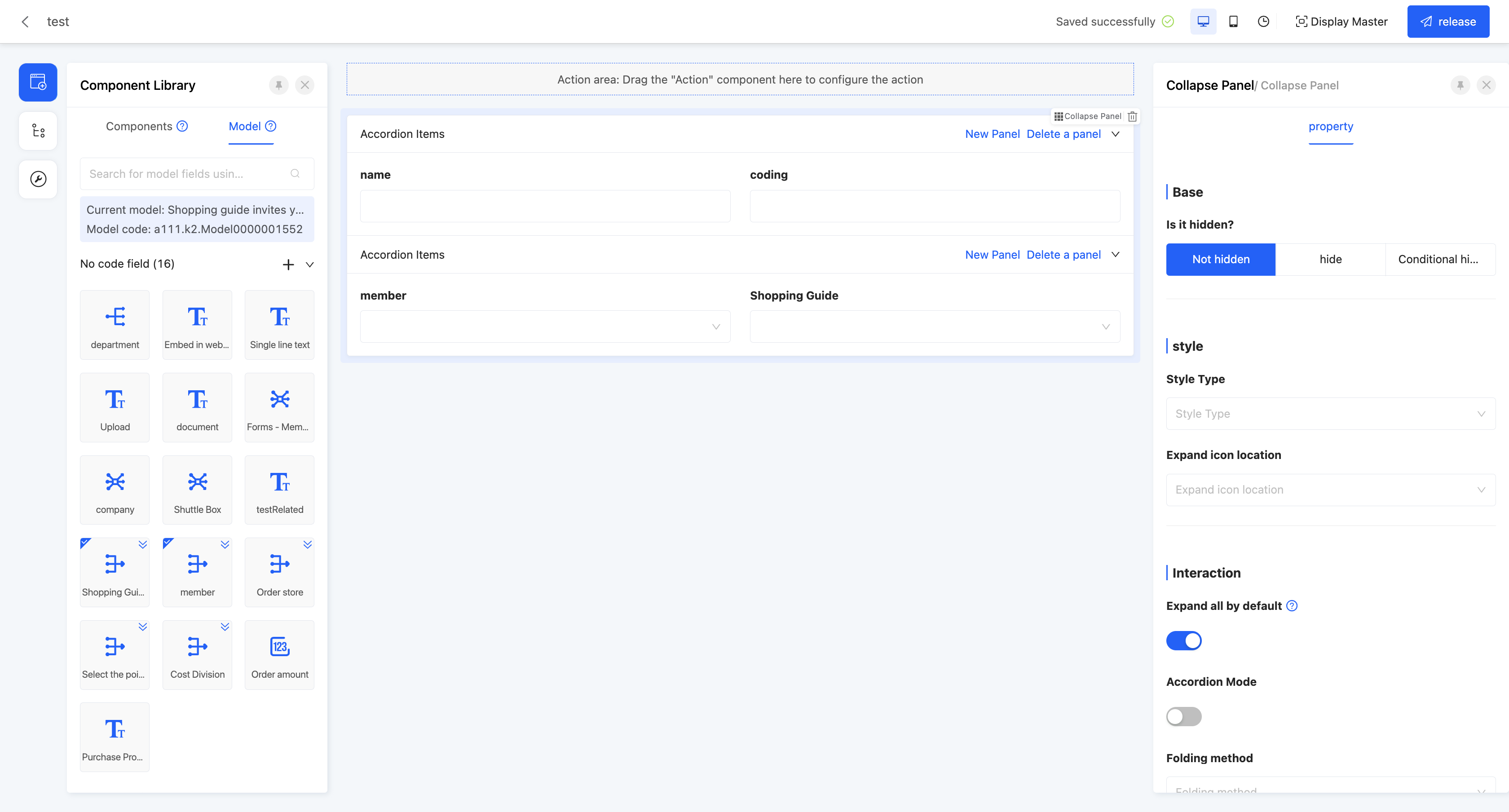 - Default Expand All: Controlled by a switch, you can set the initial state of the collapsible panel on the actual page. When the switch is on, the panel is expanded by default; when the switch is off, the panel is collapsed by default.