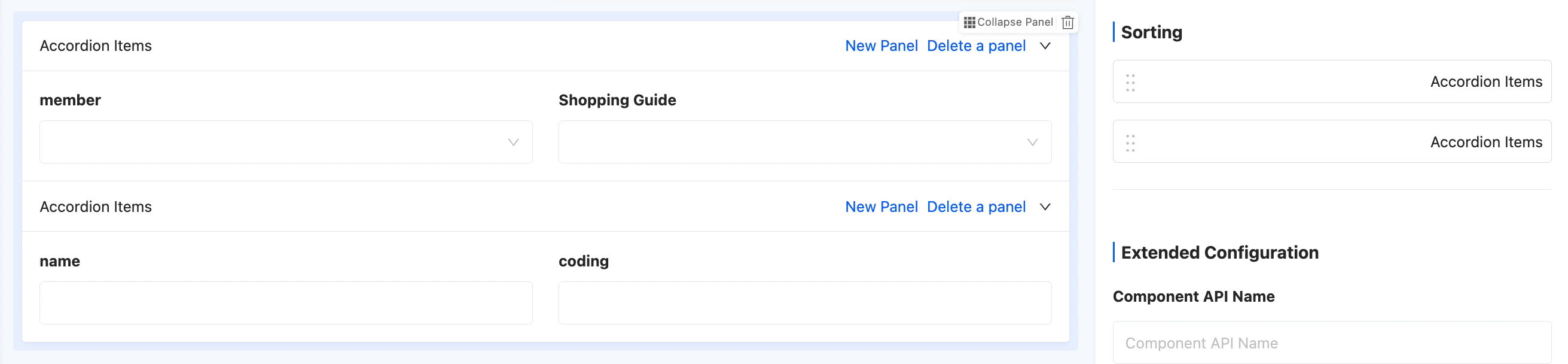 - Sorting: Supports dragging collapsible panel items to change their positions.