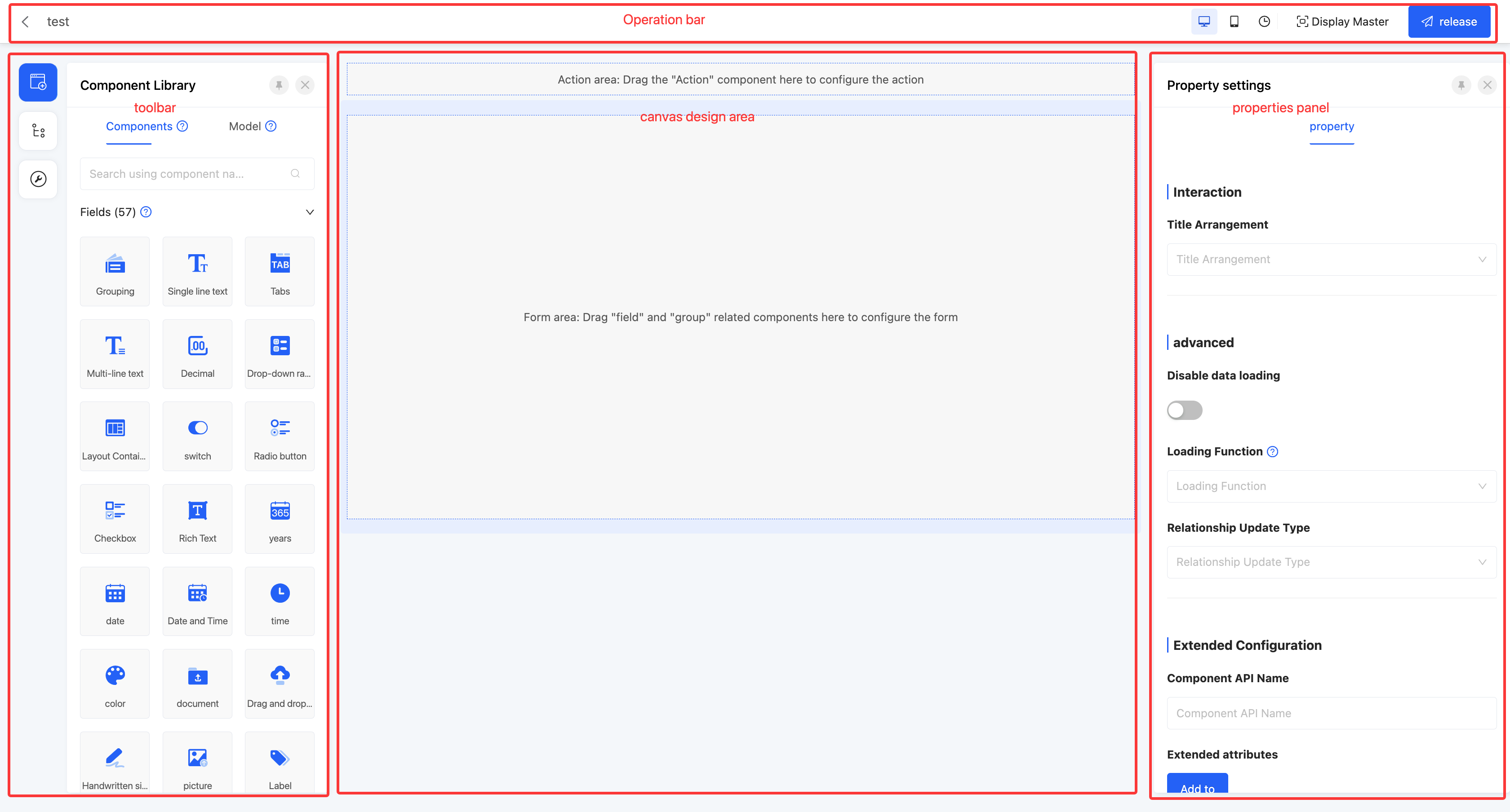 | Canvas Design Area | The main area where users design pages. Components are dragged and the layout is adjusted in this area. |