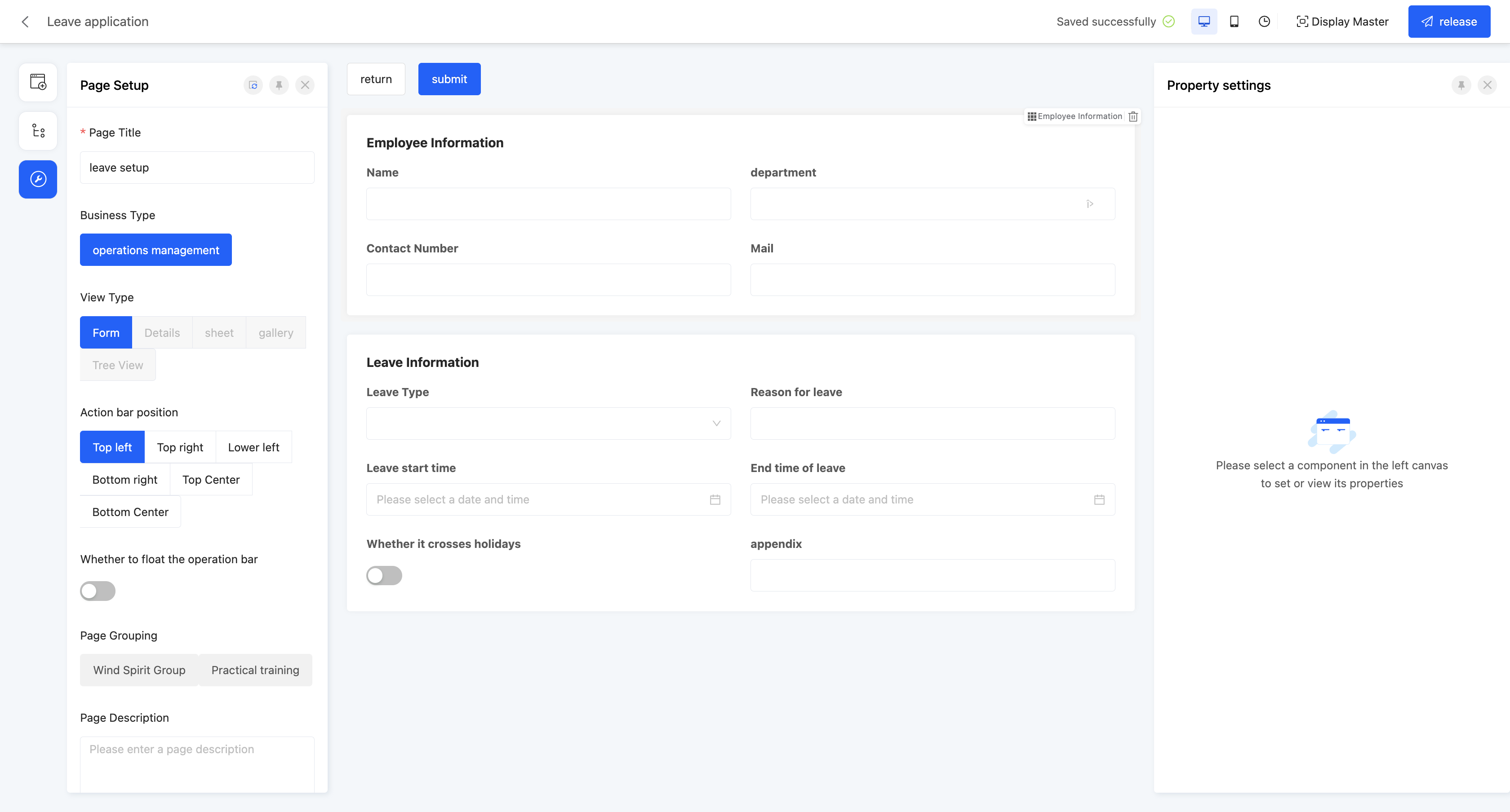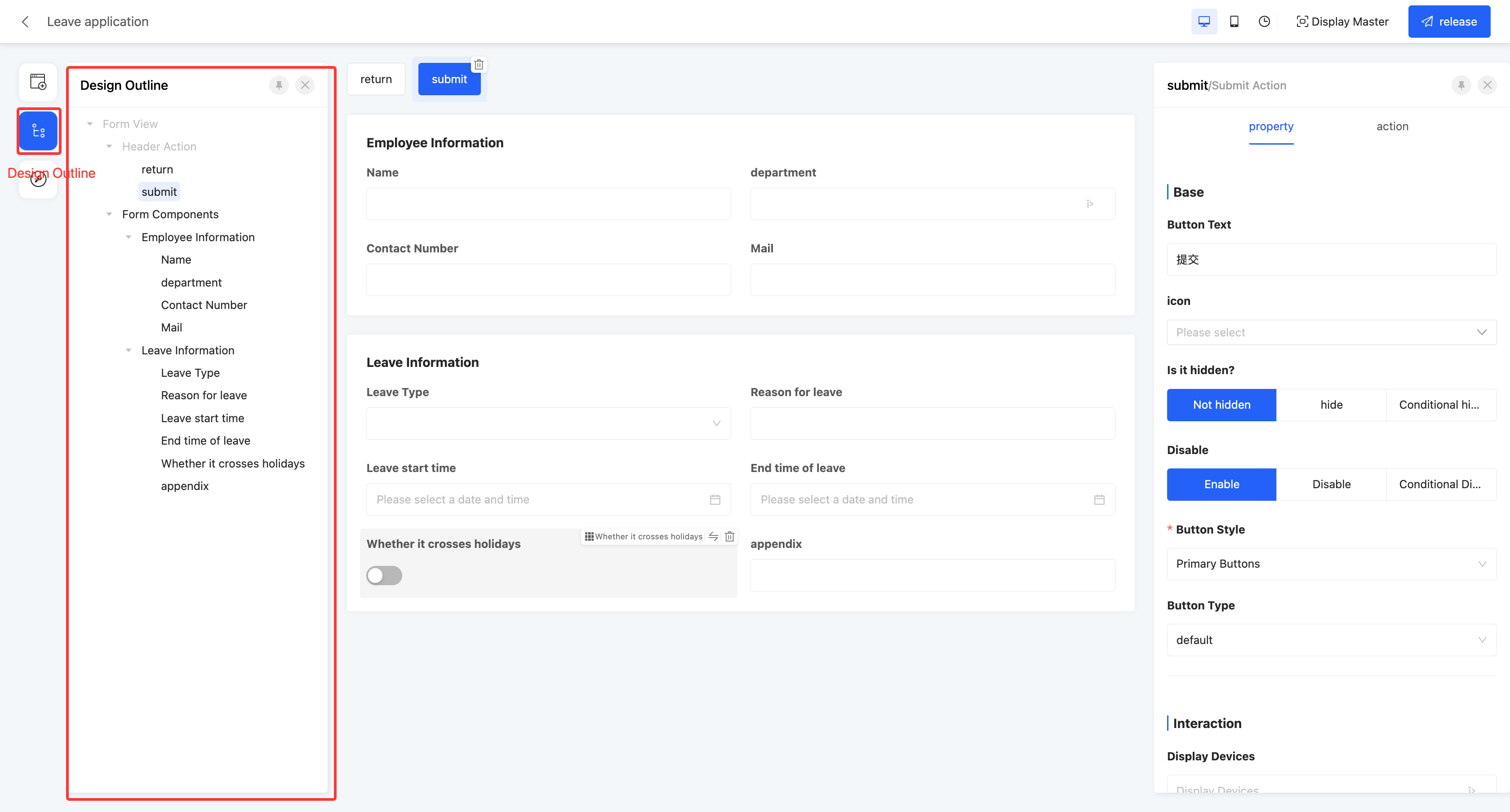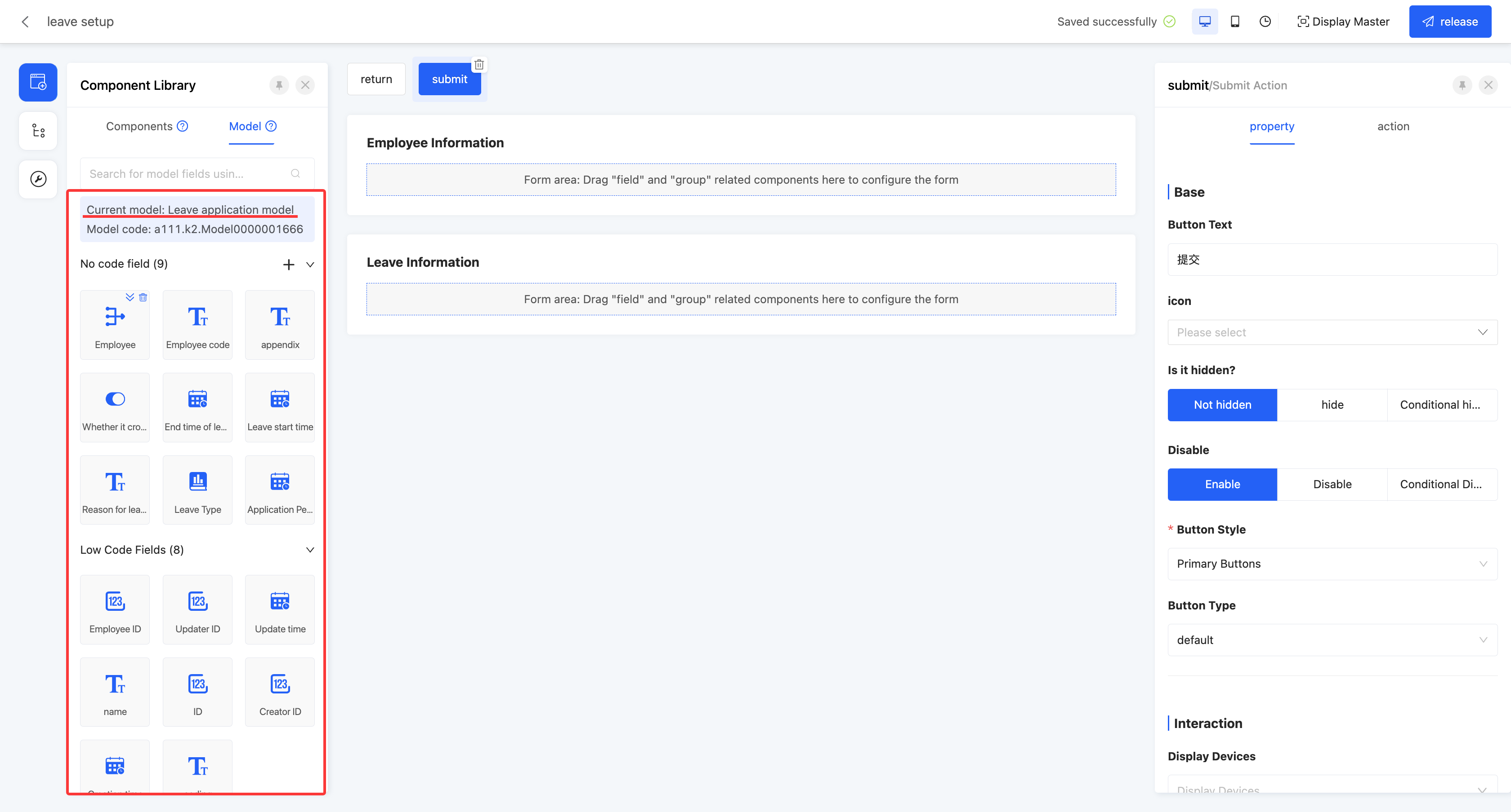 - After the model construction is completed, design the leave approval page in the interface designer. This page mainly consists of two parts: employee information and leave information.