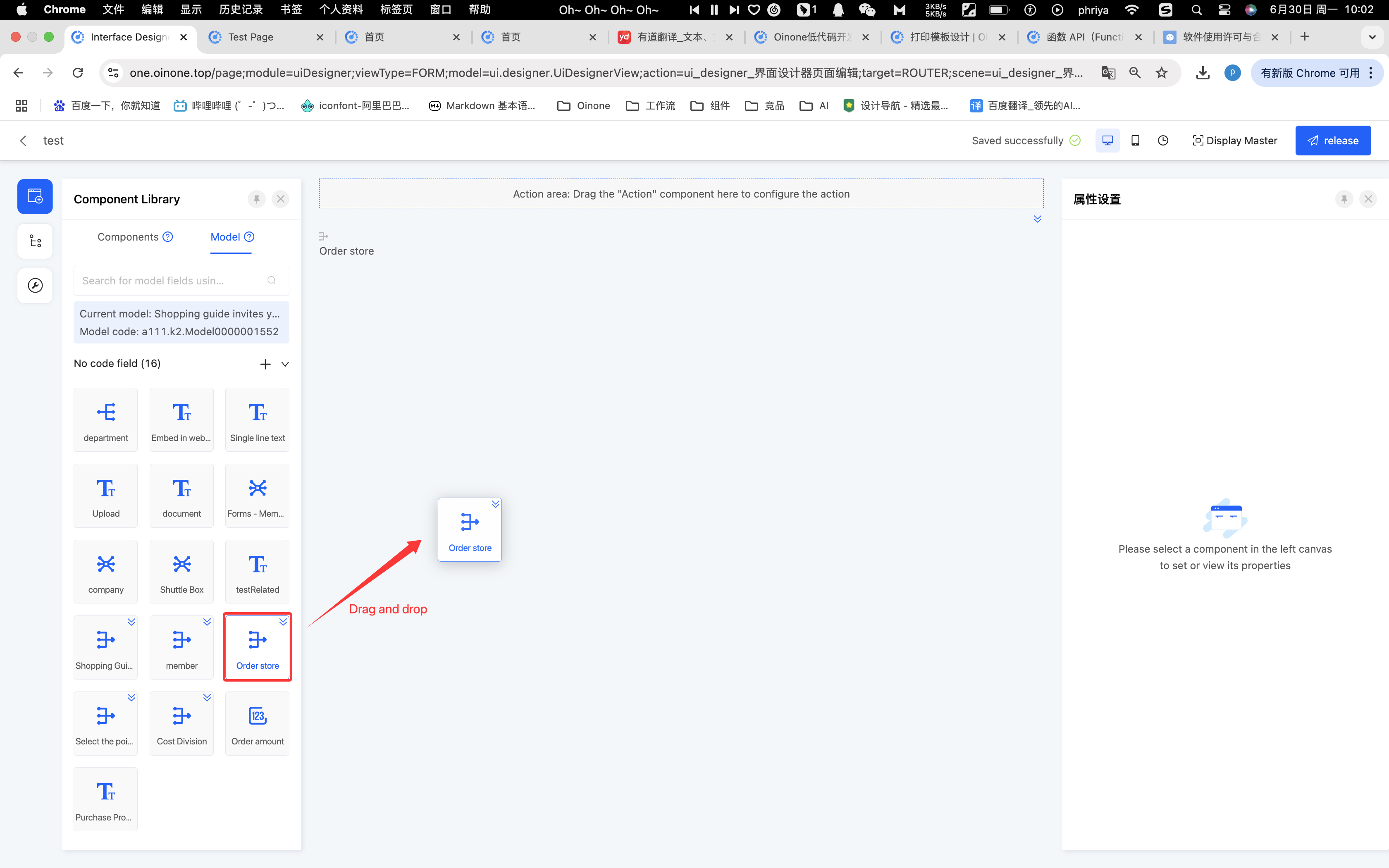 - In the component library in the left tool area, drag the component into the corresponding position in the canvas design area.