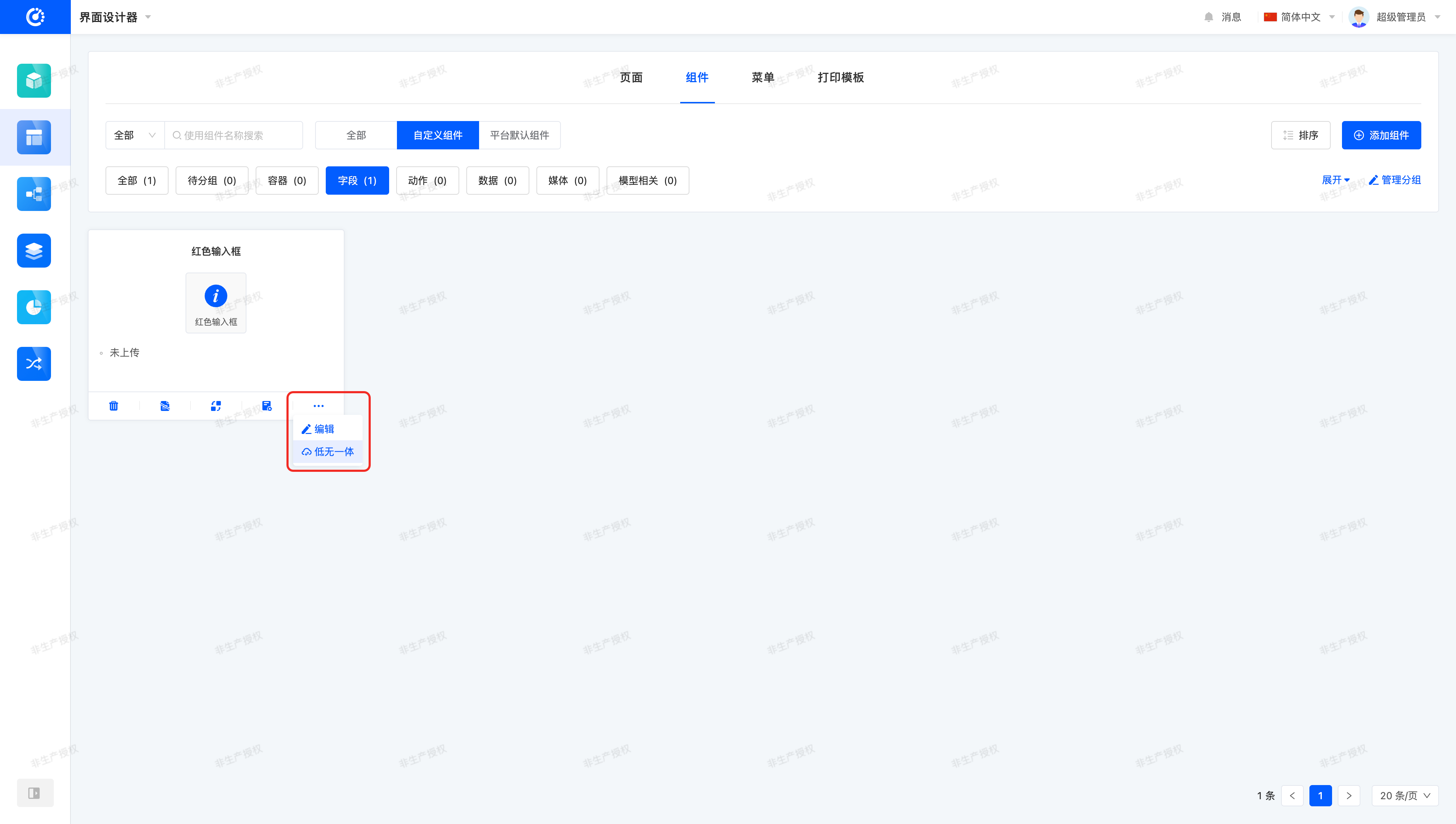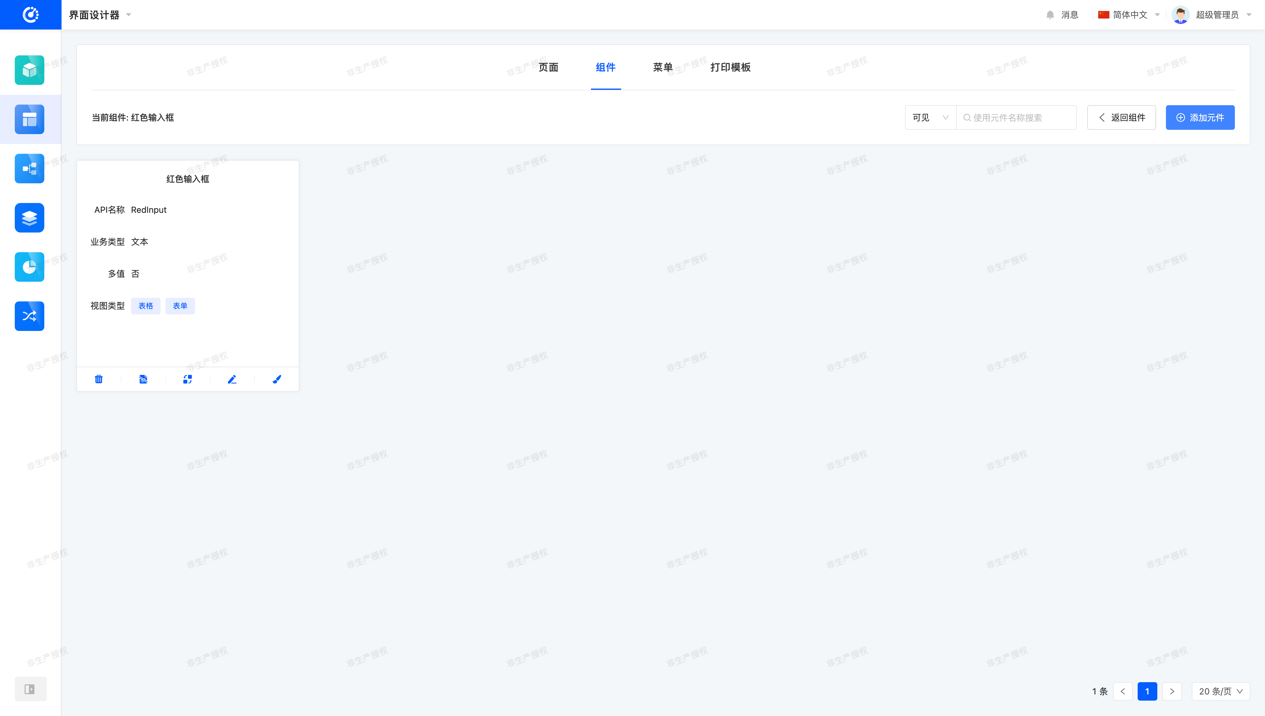 从 界面设计器 进入后选择 “组件” 一项,就可以看到组件管理页面了,就像这样:
