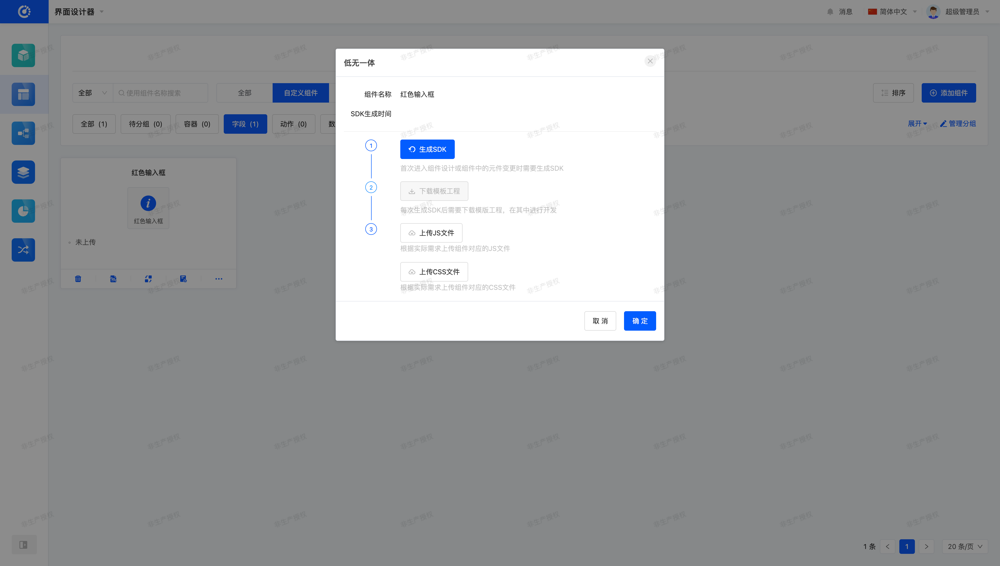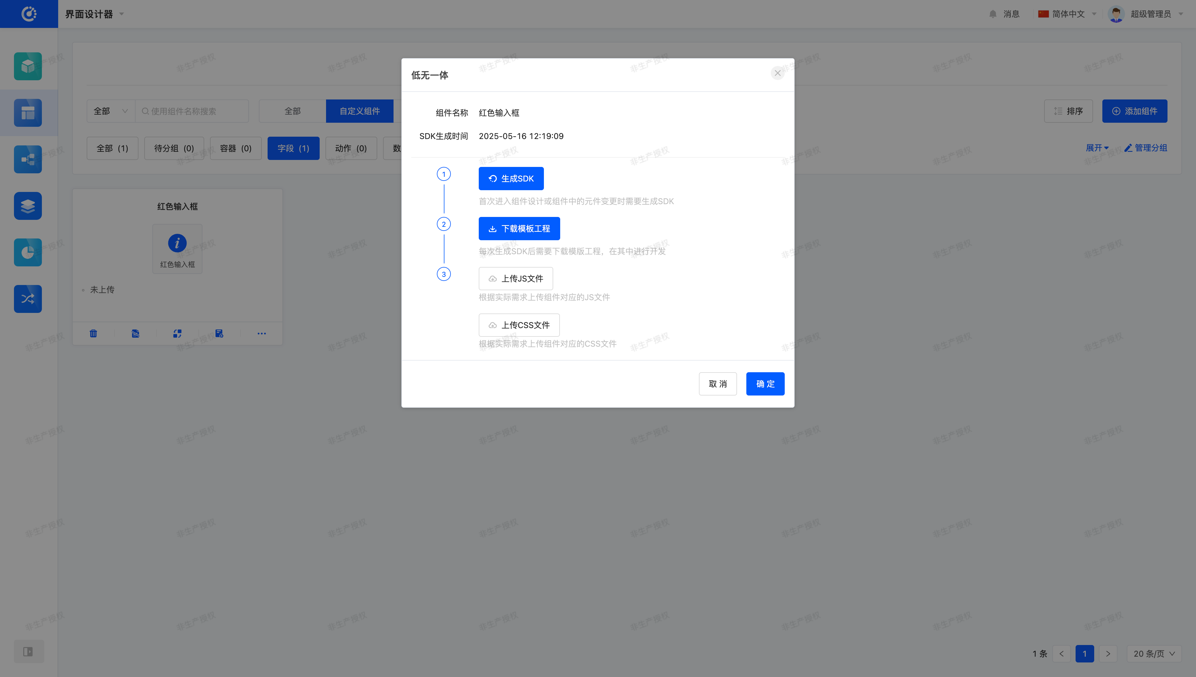 在打开的弹窗中,点击 “生成SDK” 按钮,系统将根据当前创建的元件信息生成对应的 “模板工程”:
