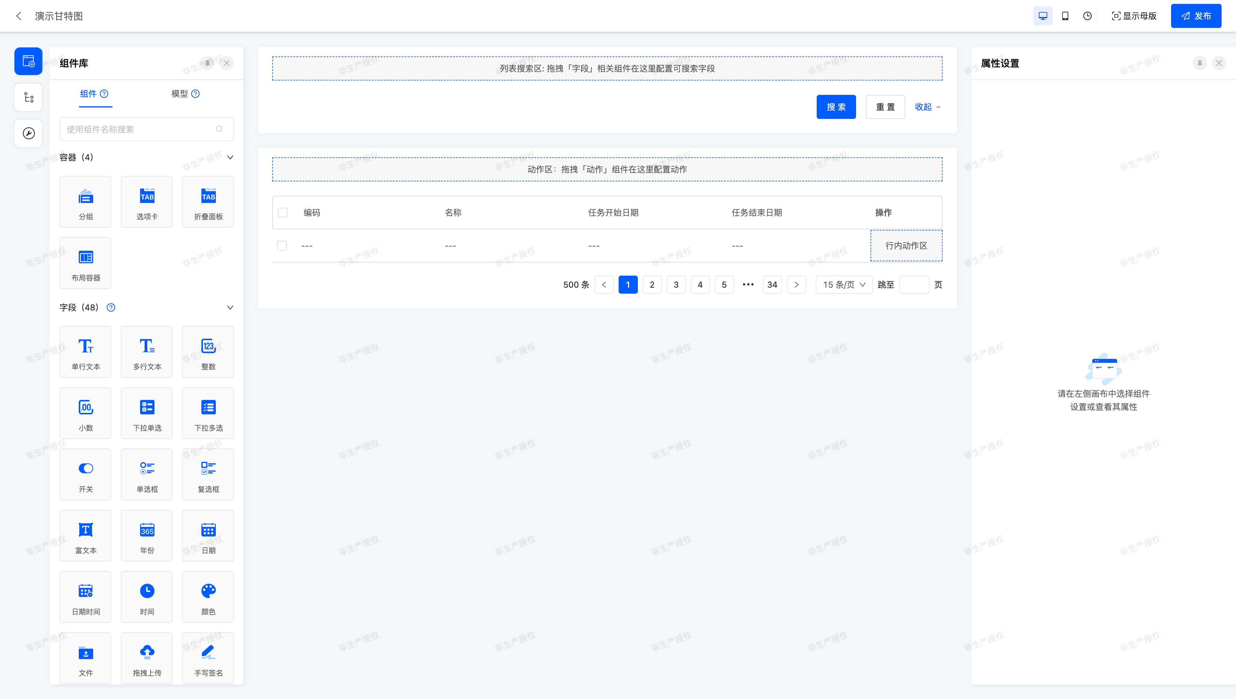 回想一下我们在 “Create a gantt view” 章节中创建的 甘特图 组件。试想一下,如果我们可以在 界面设计器 中将表格切换为 甘特图 ,并配置一些组件所必须的属性,就可以让这个表格视图以 甘特图 的样子展示在页面中。