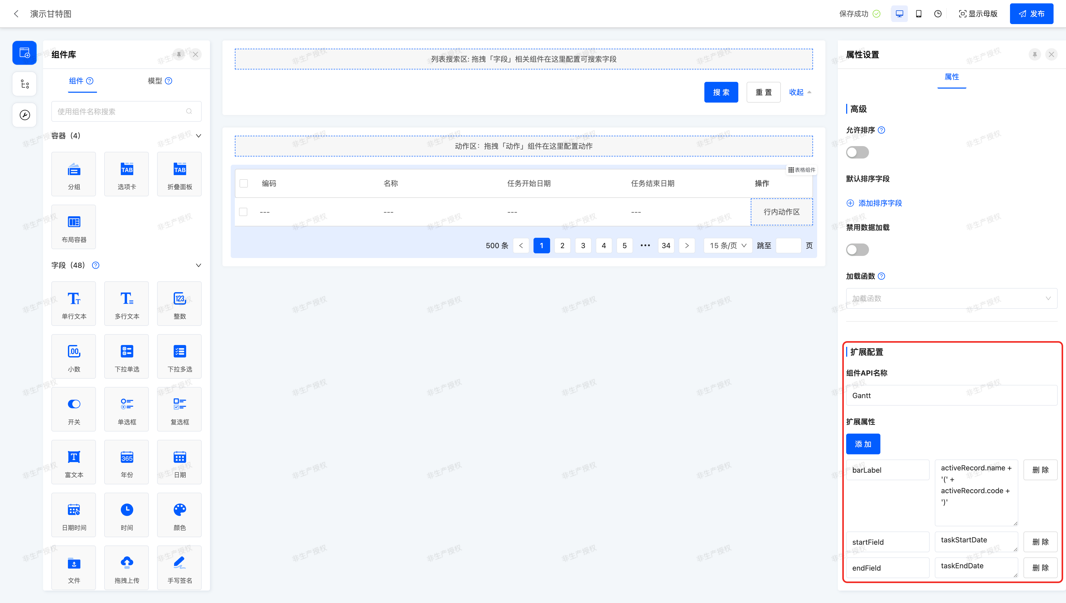 让我们把之前注册的甘特图组件对应的 widget="Gantt" 输入到 组件API名称 中,并分别配置 barLabel 、 startField 、endField 三个属性。这和我们之前在 XML 中配置属性是完全一样的。就像下面这样: