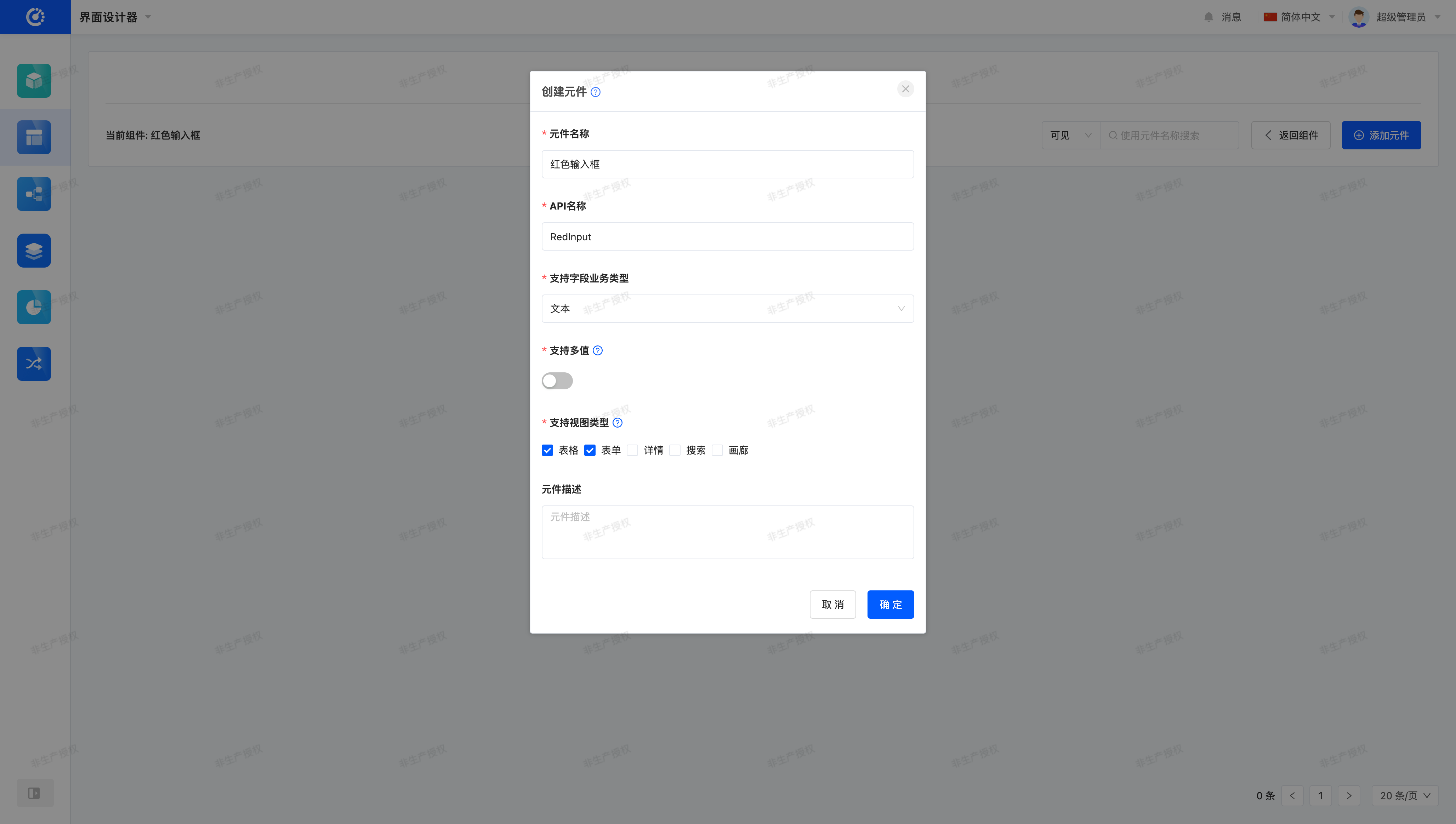 “创建元件” 页面与字段组件的注册条件一一对应: