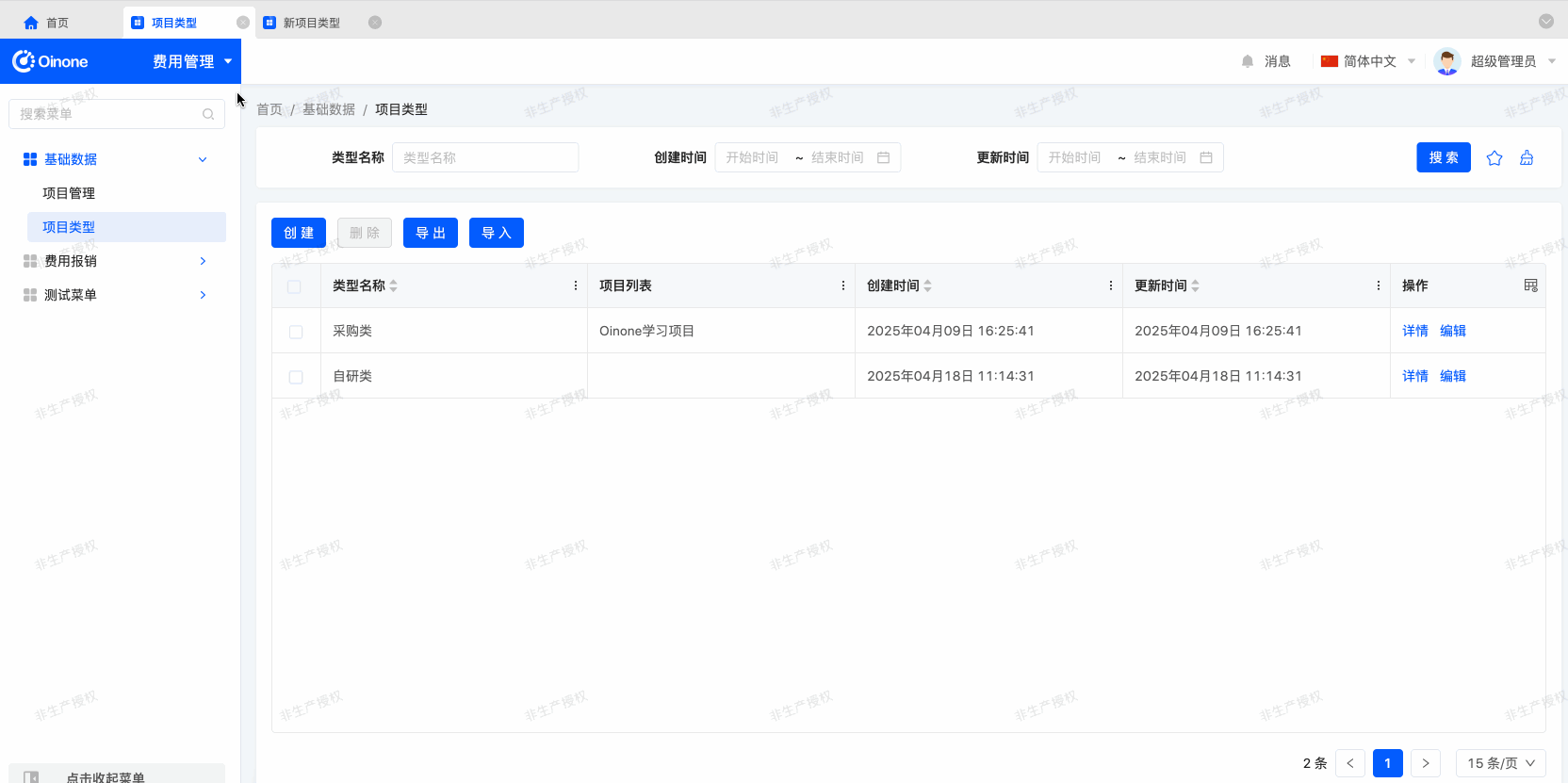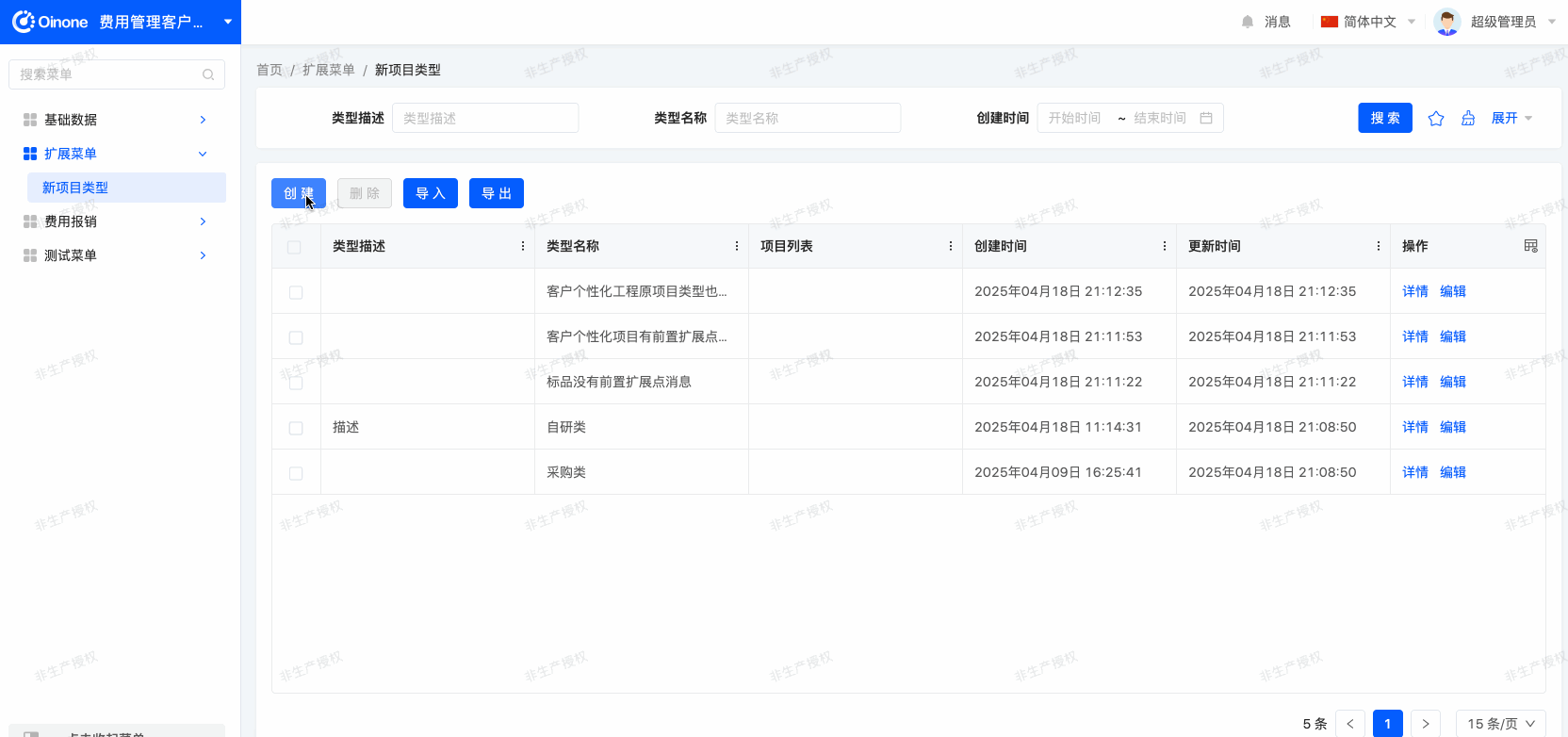 ce_expenses模块中,新增项目类型记录,提示相关信息。