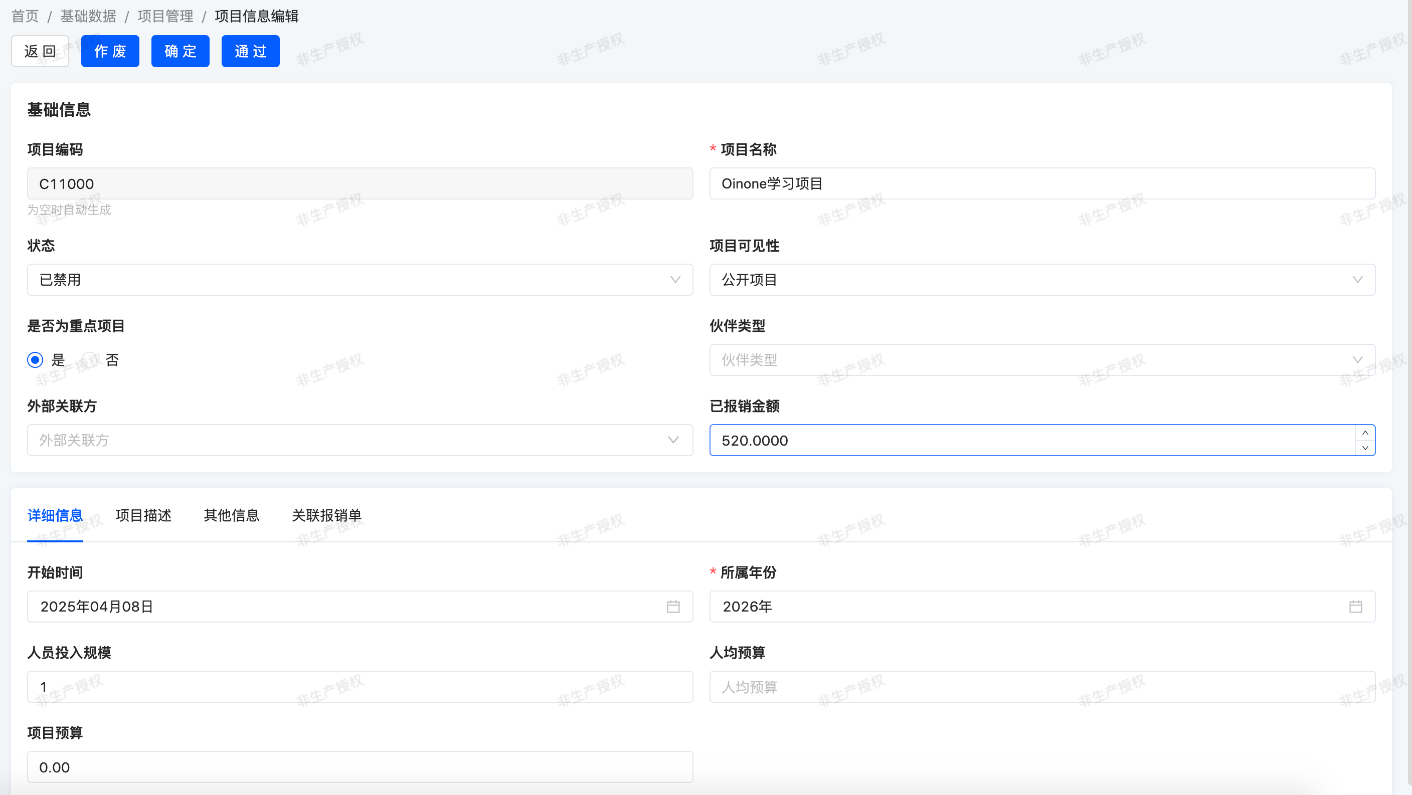 表单视图的顶部区域汇总了项目的重要信息,比如项目名称、状态、已经报销金额、项目等级等等。第一个标签页包含了描述该项目信息有关预算相关的信息:人员投入规模、人均预算、项目预算、开始时间等。