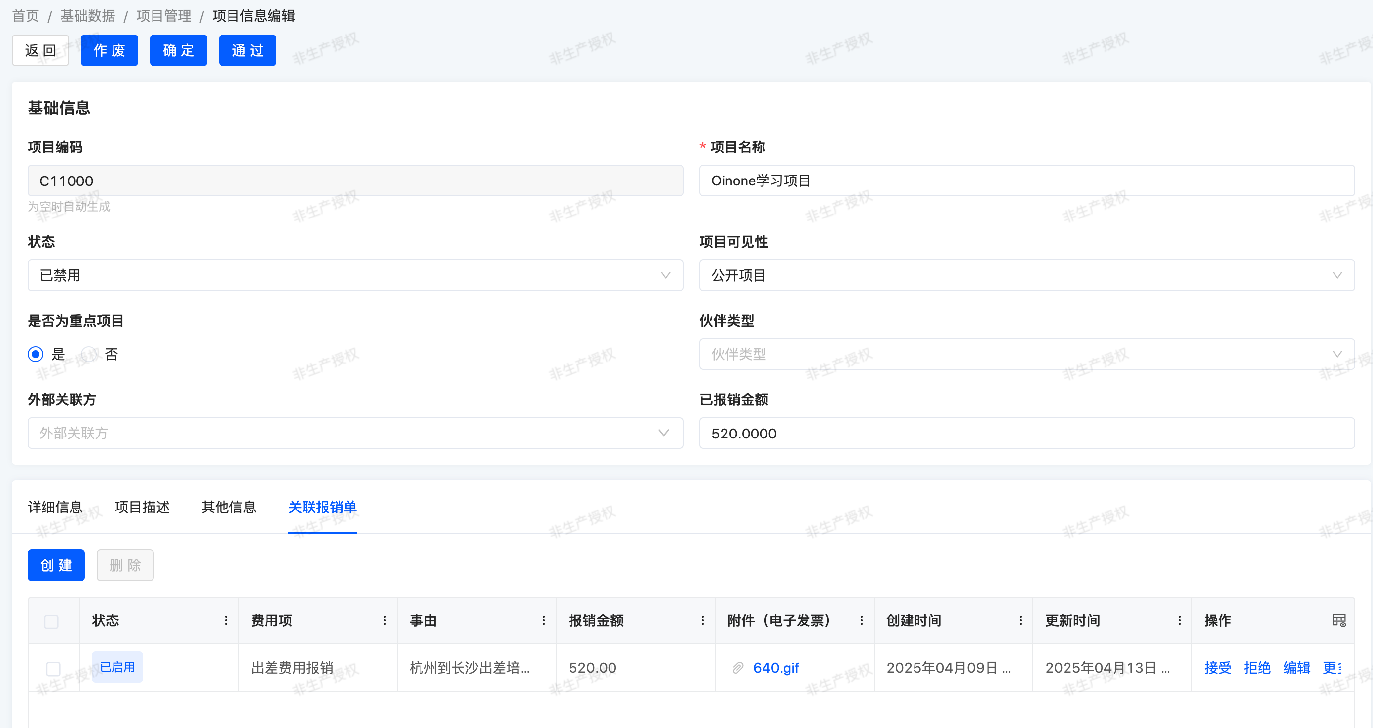 第四个标签页列出了该项目关联的报销单。如费用项、事由、报销金额、报销状态等。