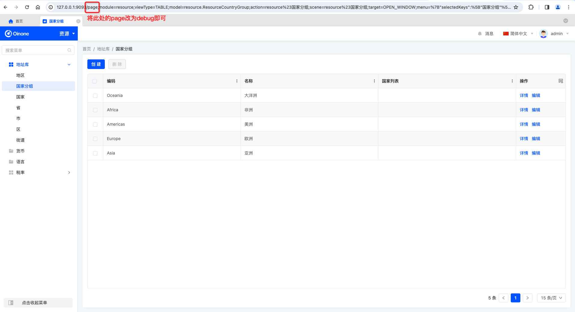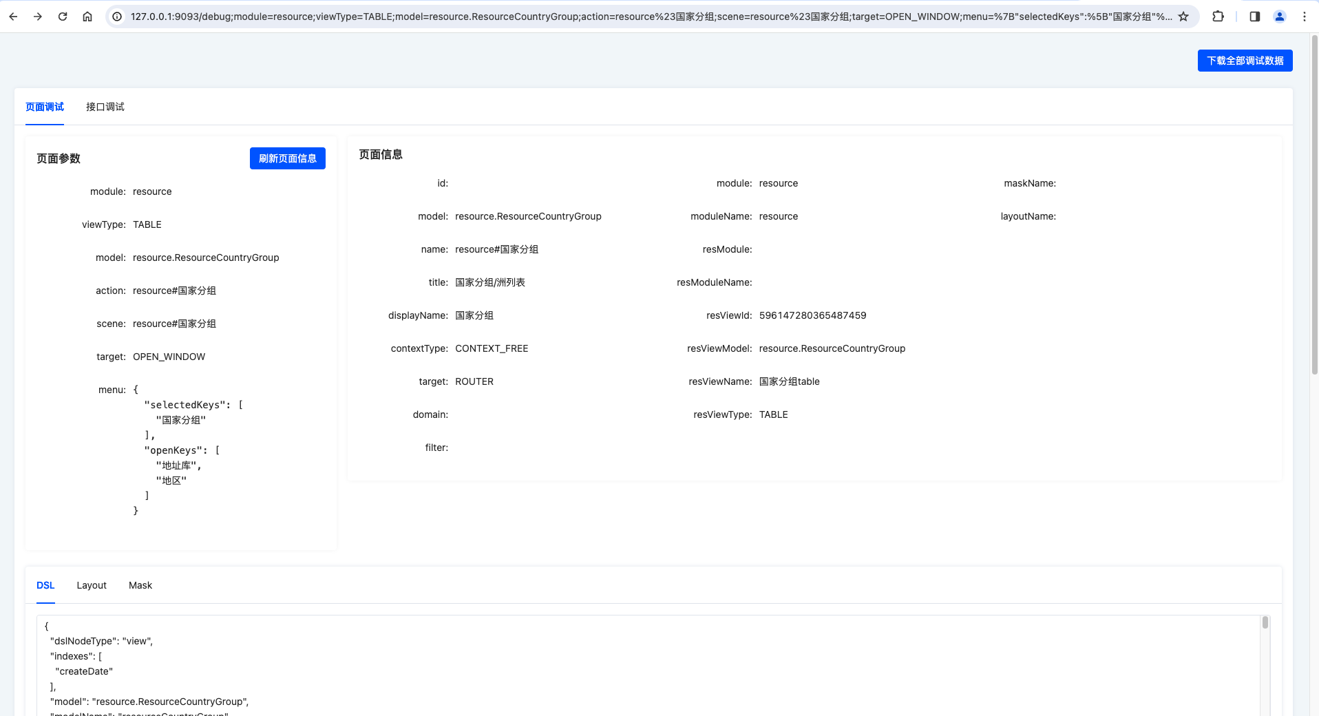 http://127.0.0.1:9093/page;module=resource;viewType=TABLE;model=resource.ResourceCountryGroup;action=resource%23%E5%9B%BD%E5%AE%B6%E5%88%86%E7%BB%84;scene=resource%23%E5%9B%BD%E5%AE%B6%E5%88%86%E7%BB%84;target=OPEN_WINDOW;menu=%7B%22selectedKeys%22:%5B%22%E5%9B%BD%E5%AE%B6%E5%88%86%E7%BB%84%22%5D,%22openKeys%22:%5B%22%E5%9C%B0%E5%9D%80%E5%BA%93%22,%22%E5%9C%B0%E5%8C%BA%22%5D%7D将 page 改为 debug 后即可进入该页面的调试页面,如下所示: