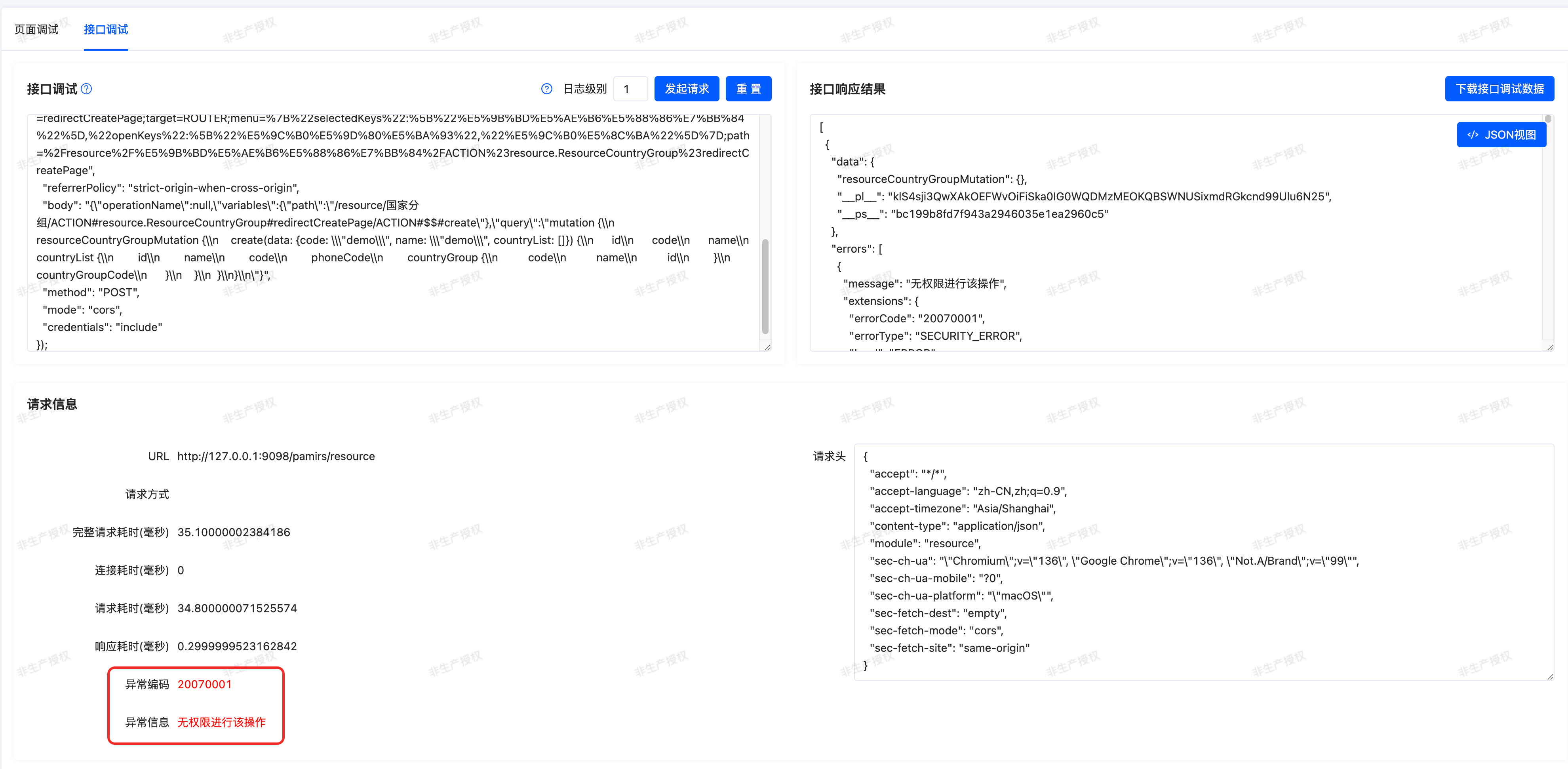 当接口出现如下图所示的 “无权限进行该操作” 等相关异常时: