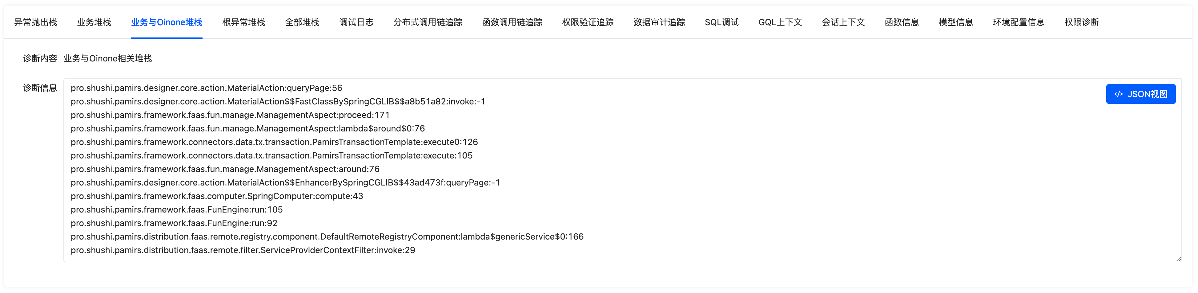 如果 “问题第一现场” 无法准确定位问题,则可以通过 “业务堆栈” 来查看一些与 Spring 框架或 Oinone 框架无关的堆栈信息: