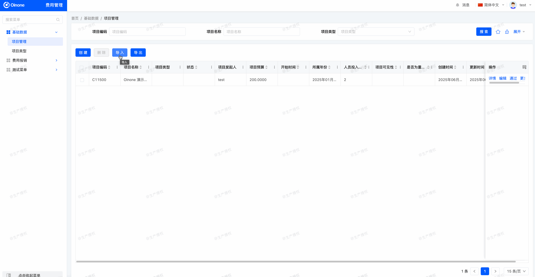 - 创建导入扩展点(ProjectInfoImportExtPoint),在保存项目信息之前,对项目类型进行处理:如果输入的项目类型名称重复,则获取首个项目类型;如果输入的项目类型名称不存在,则创建对应名称的项目类型。