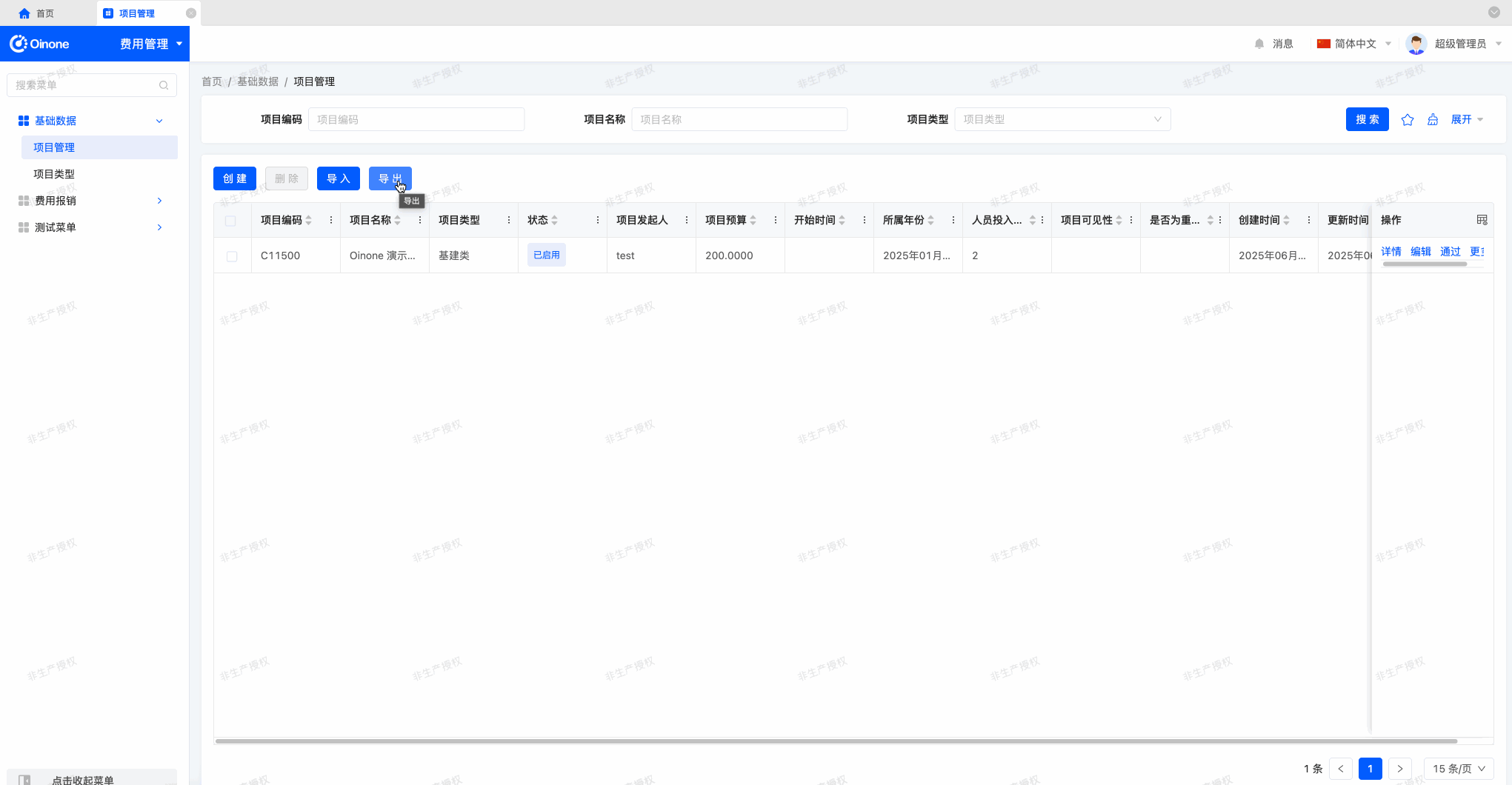 - 通过 “基础数据 - 项目管理” 页面的导出按钮弹窗,选中 “项目信息导出” 模板导出当前所有项目信息数据,最后跳转至 “文件 - 导出任务” 页面下载导出的文件。