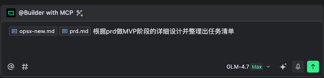 选择 GLM-4.7,打开 MAX-MODE 模式, 选择Builder with MCP模式