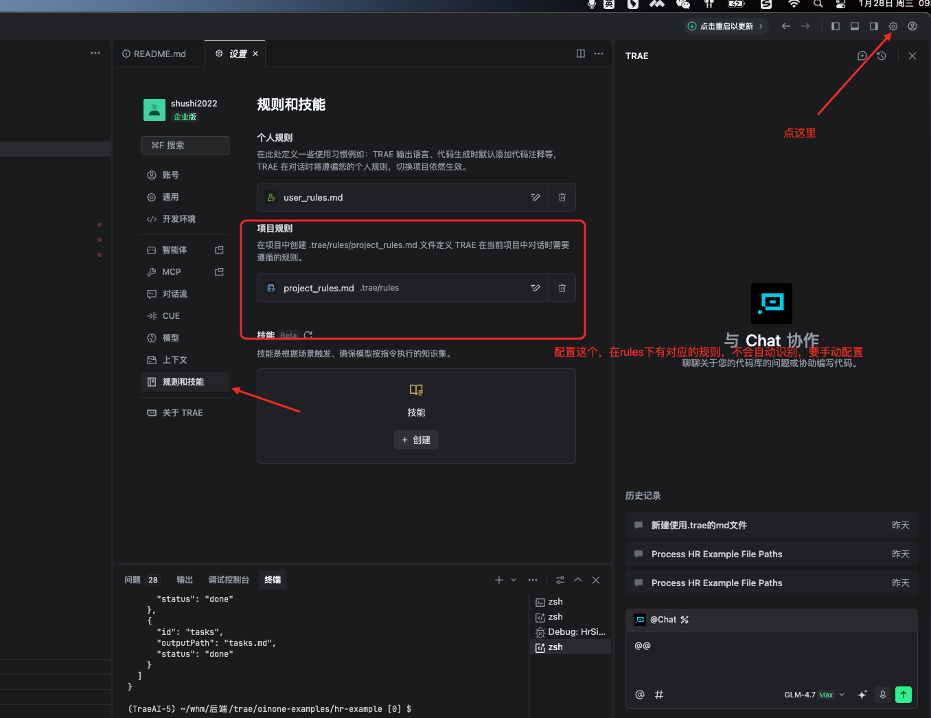 .trae目录下放有源码,AI会自动扫描代码并增加依赖。但是非常耗时而且扫描的文件多了容易出错。如果我们自己手工做一下,就会降低AI的理解成本。跟初学者一样,通常会卡在环境搭建上,AI也一样。如果环境搭建好。那么AI也会给你更好的反馈 - 不要指望一次完成,把大任务拆成小任务,同时把任务分层。最终按分层分批执行。比如先建模型与菜单、再写