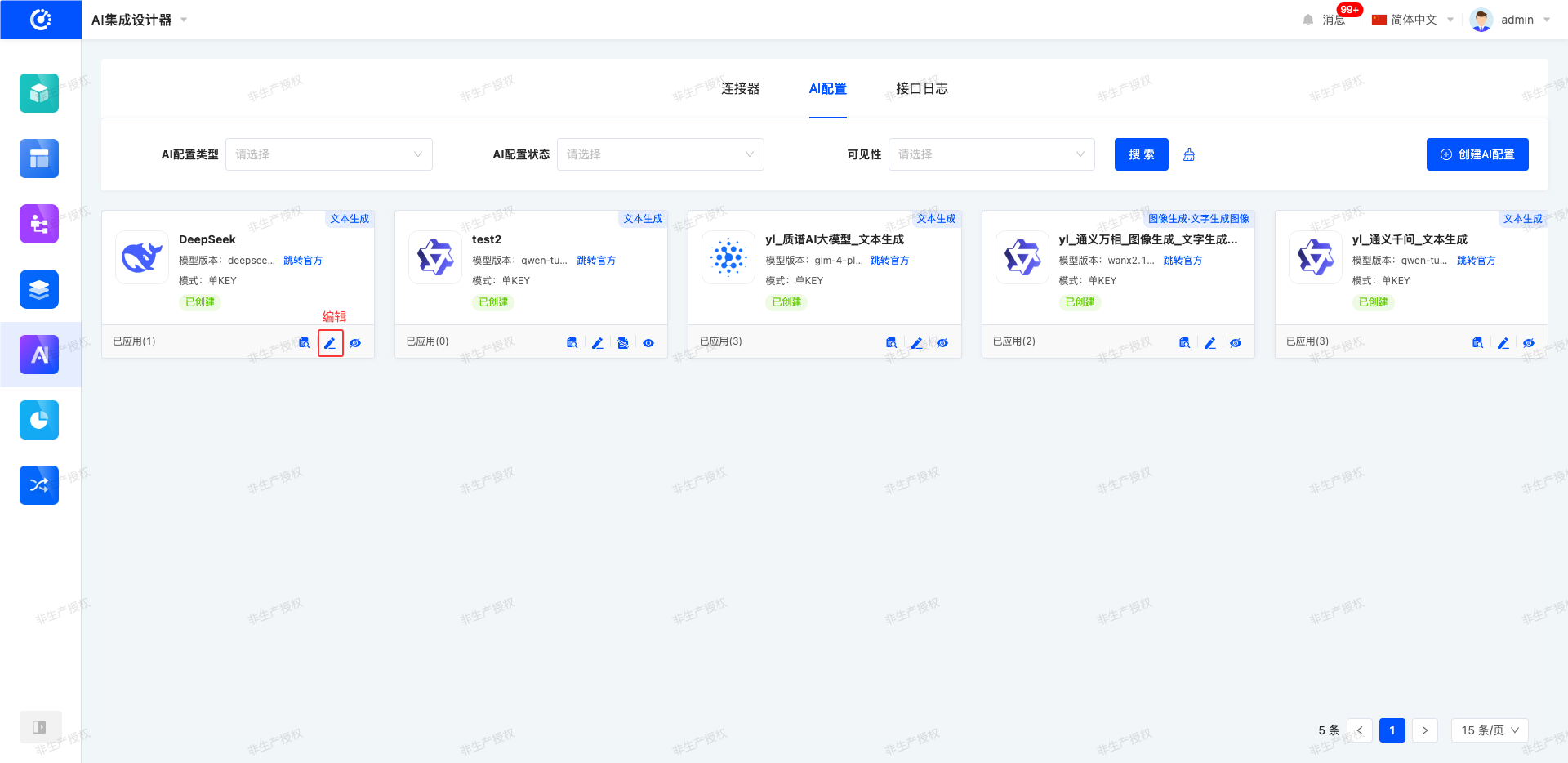 系统提供 AI 配置创建功能,支持用户根据业务场景与使用需求,定义名称、大模型URL、API Key等多维配置信息。所创建的 AI 配置可在连接器中被使用,实现与各类 AI 大模型的适配与调用,为用户构建个性化 AI 应用场景提供标准化、模块化的配置支持。