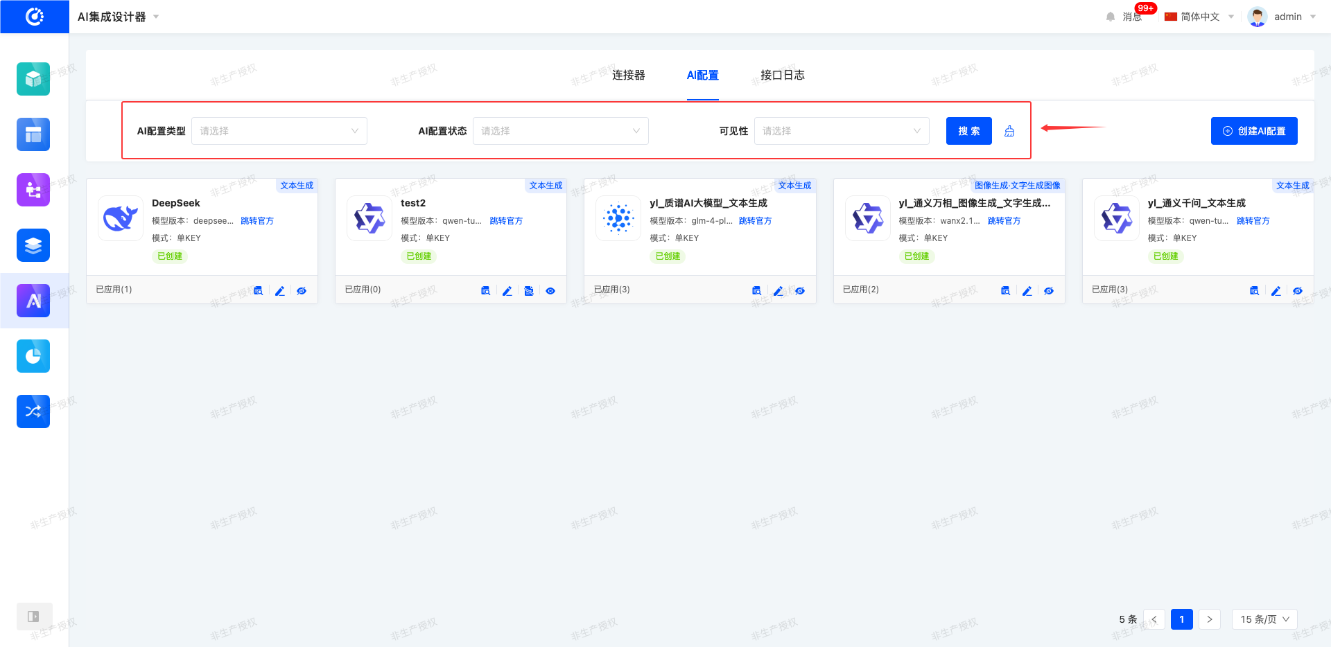 - 筛选:在筛选区输入条件后点击「搜索」,即可对AI配置进行筛选。