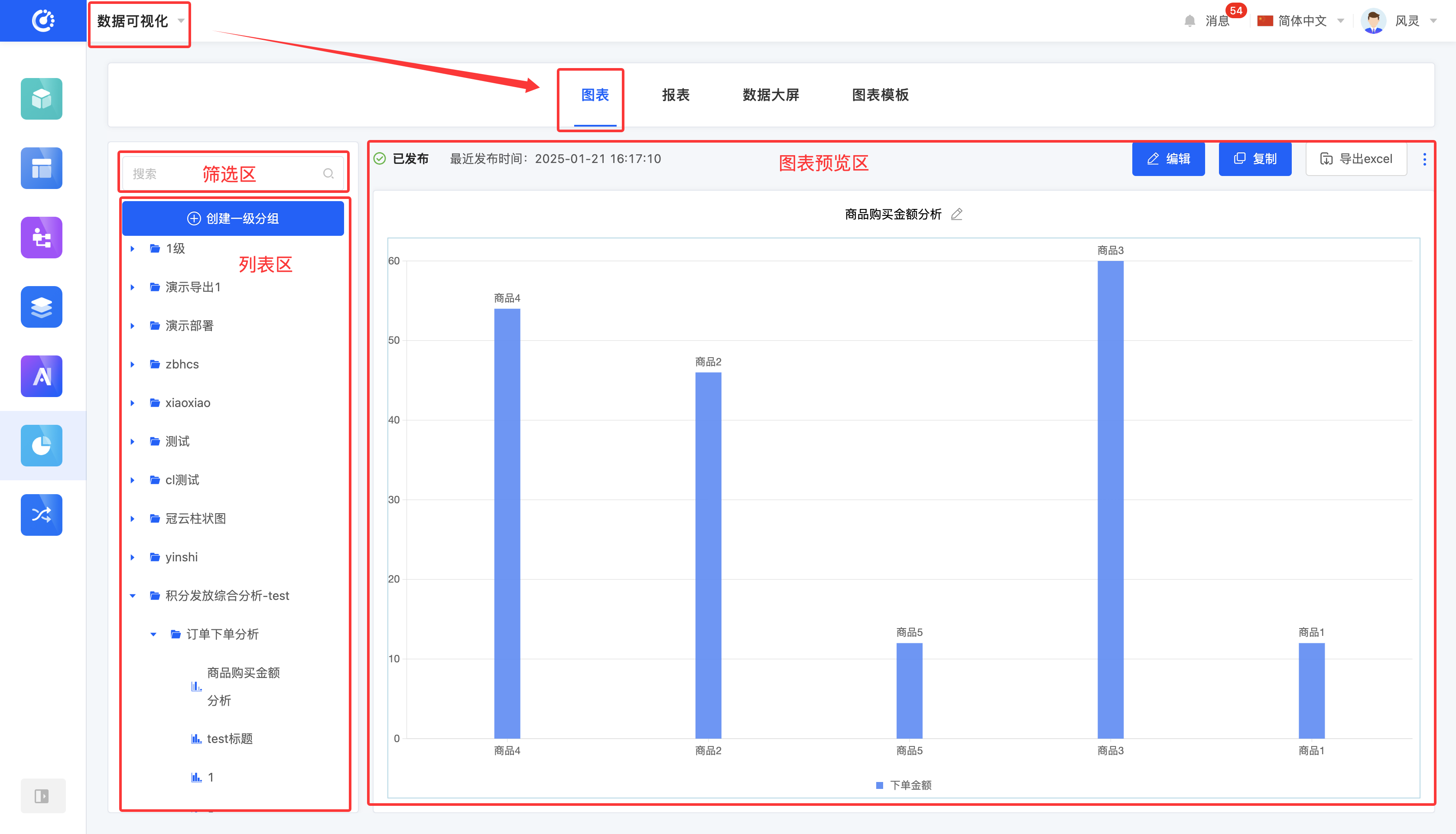 进入数据可视化后的「图表」页面可对图表进行管理,该页面主要包含三个部分:筛选区、列表区与图表预览区: