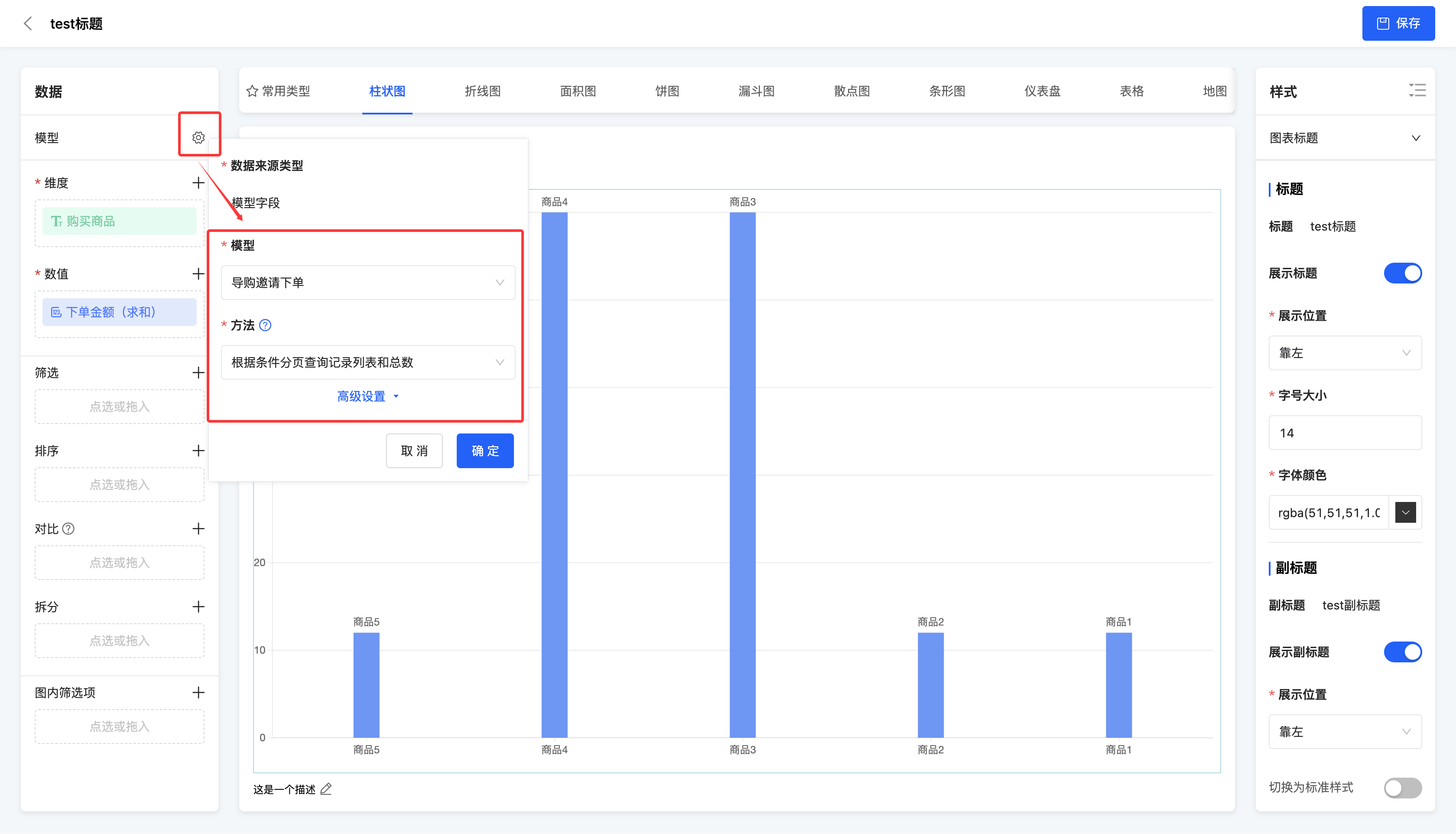 - 在设计图表时编辑,可以编辑数据来源类型、方法、标题、副标题以及描述。