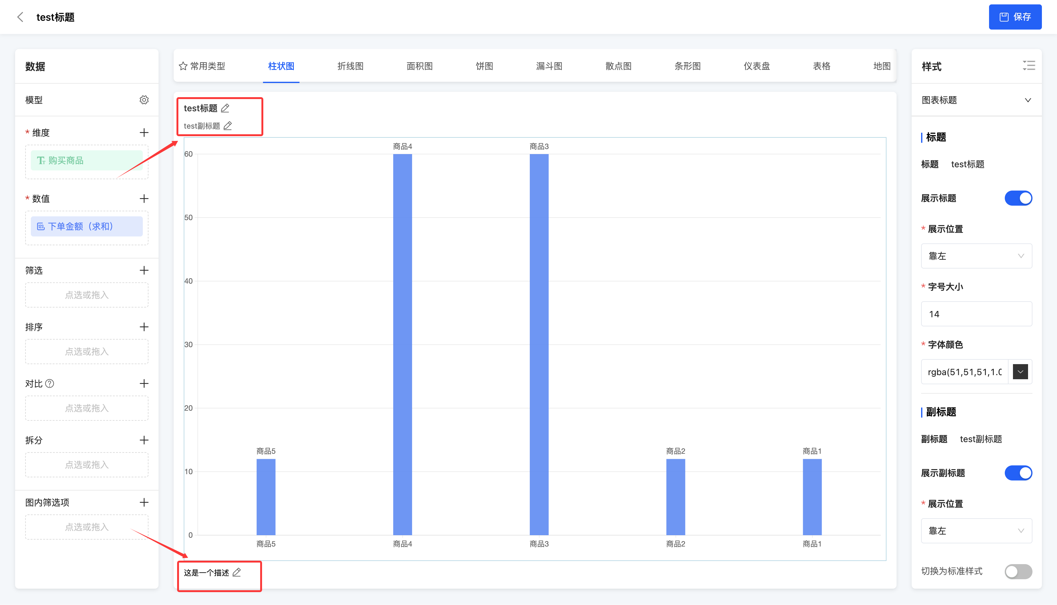 - 在图表预览区编辑,可以编辑标题、副标题、描述