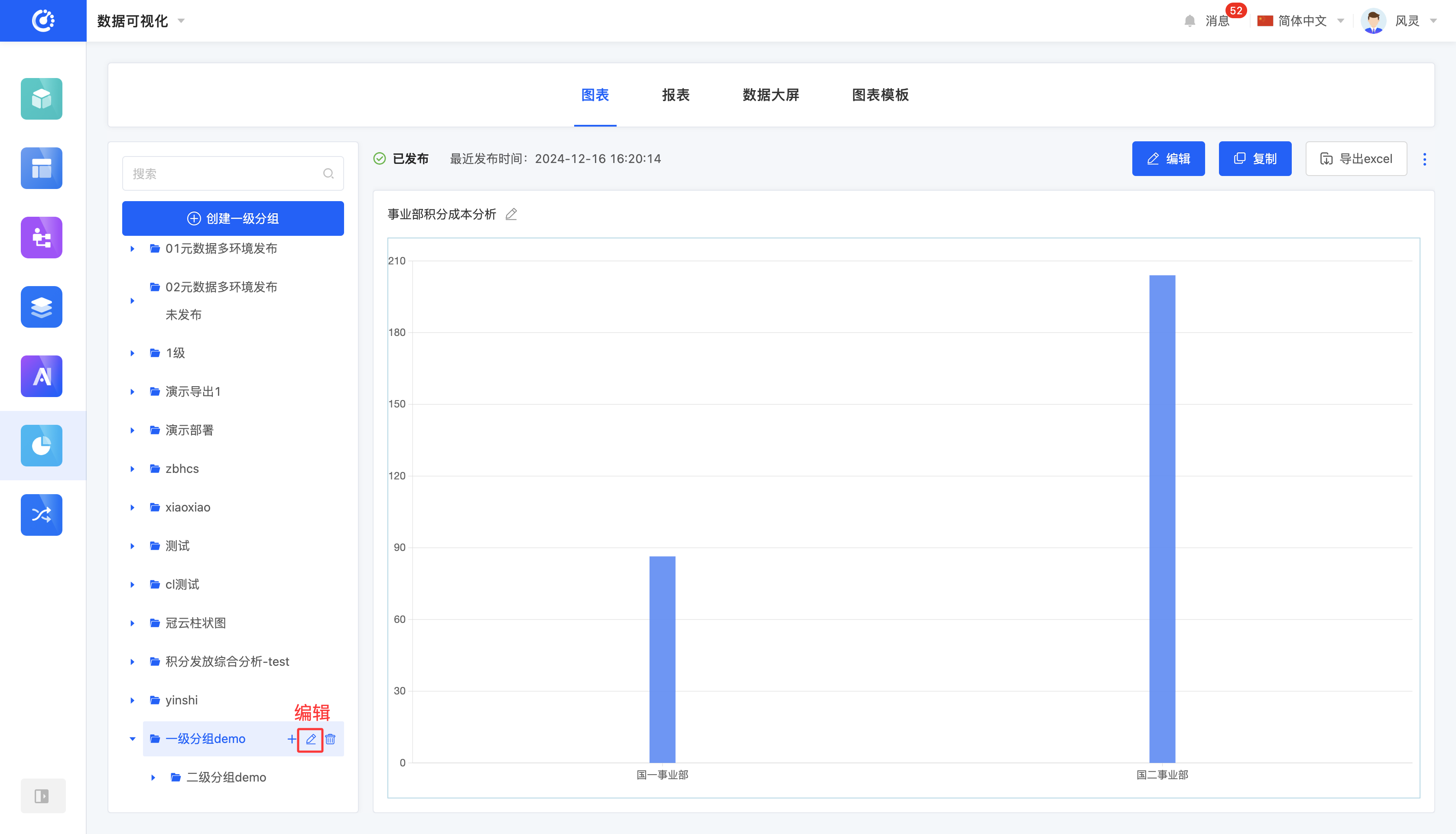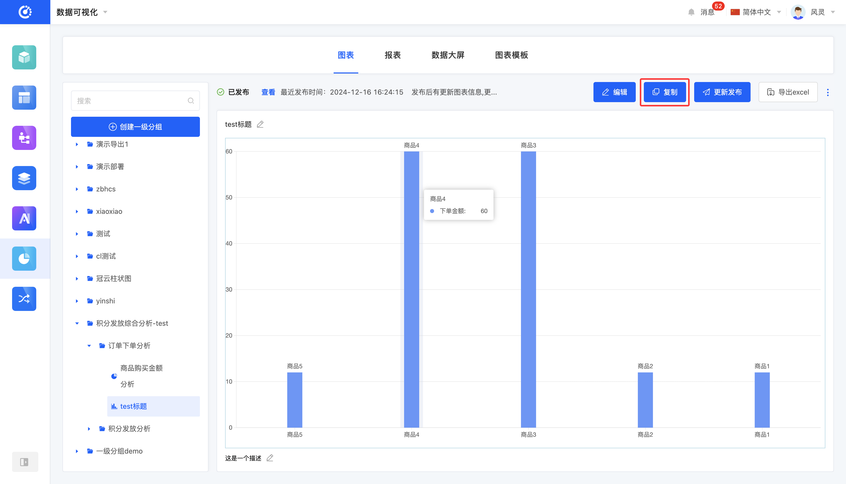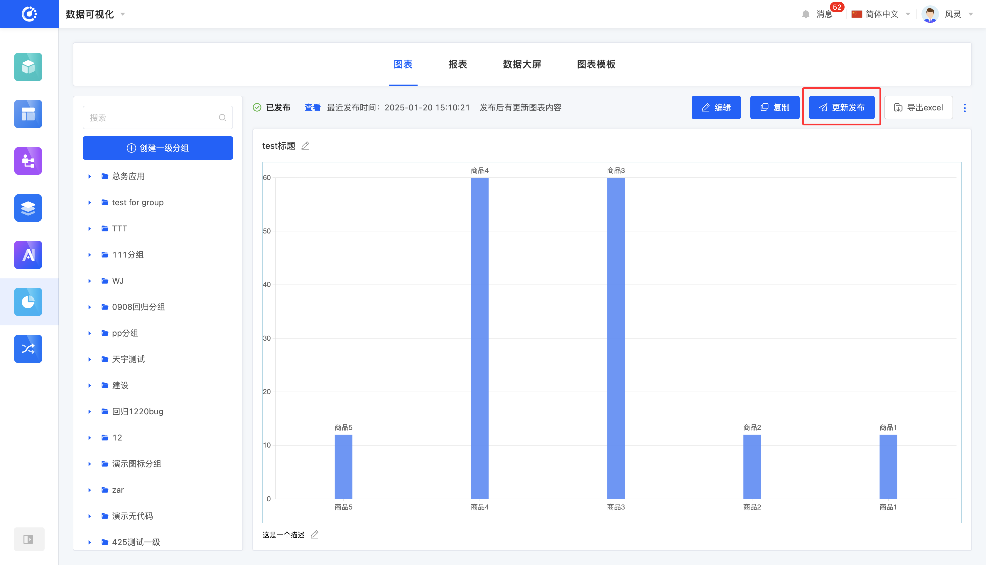图表设计完成后,用户可以选择发布图表。发布后的图表可在其他设计器中被引用,同时展示最近发布时间。若图表发布后有内容更新,原本的“发布”按钮将变为“更新发布”。