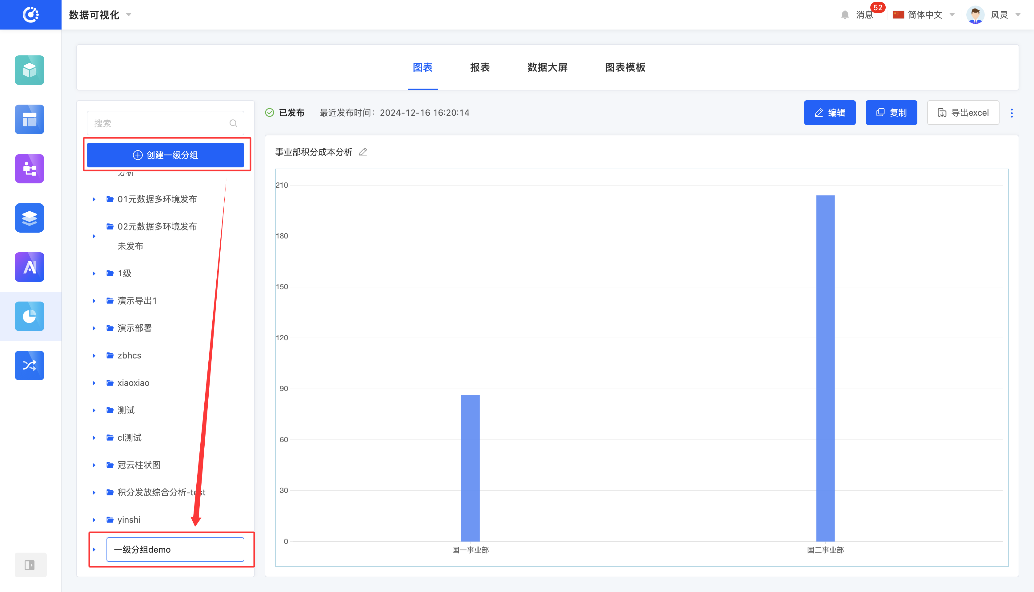 - 只能拖动同级分组,不可以将一级分组变为二级分组或将二级分组变为一级分组,同理,创建好的图表不允许变为分组。