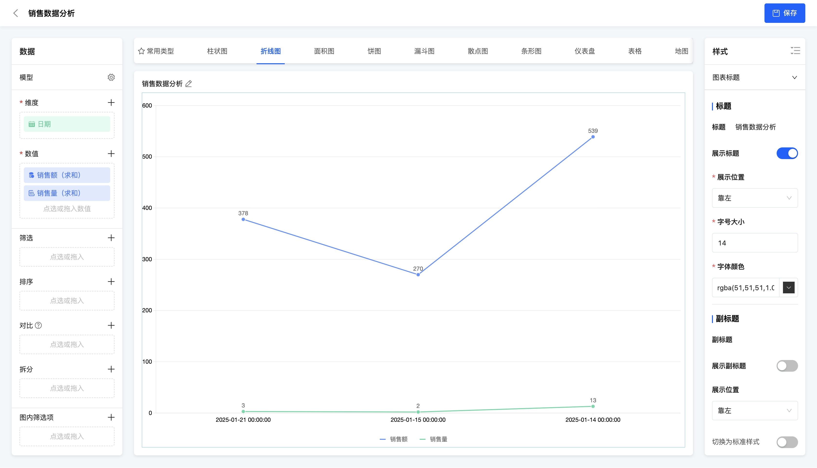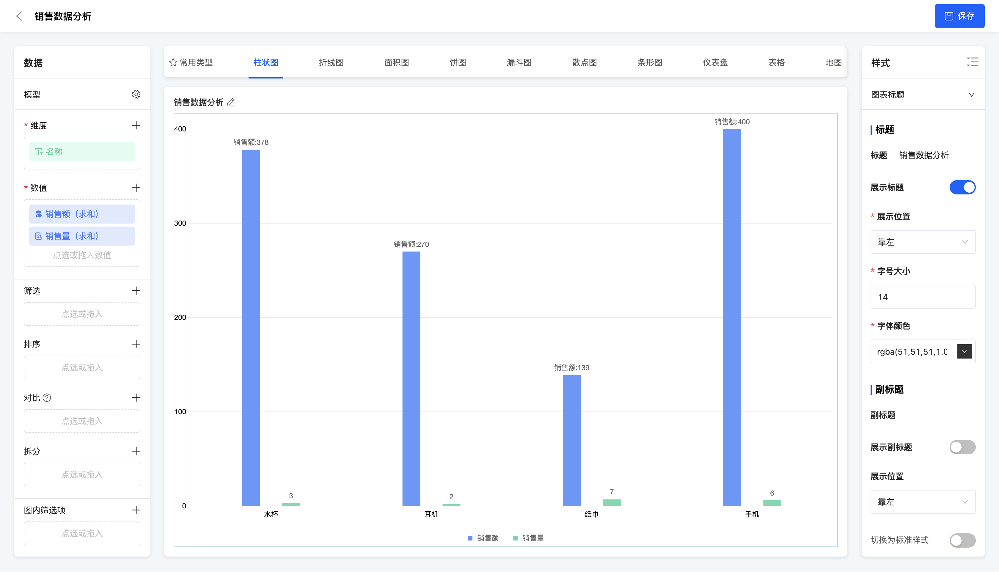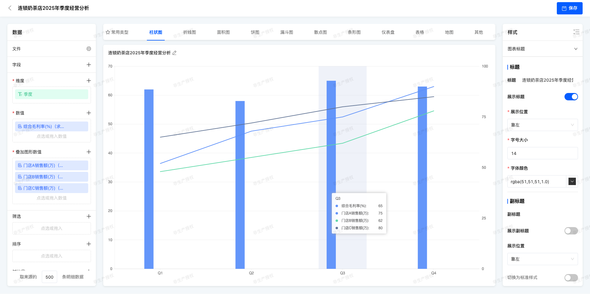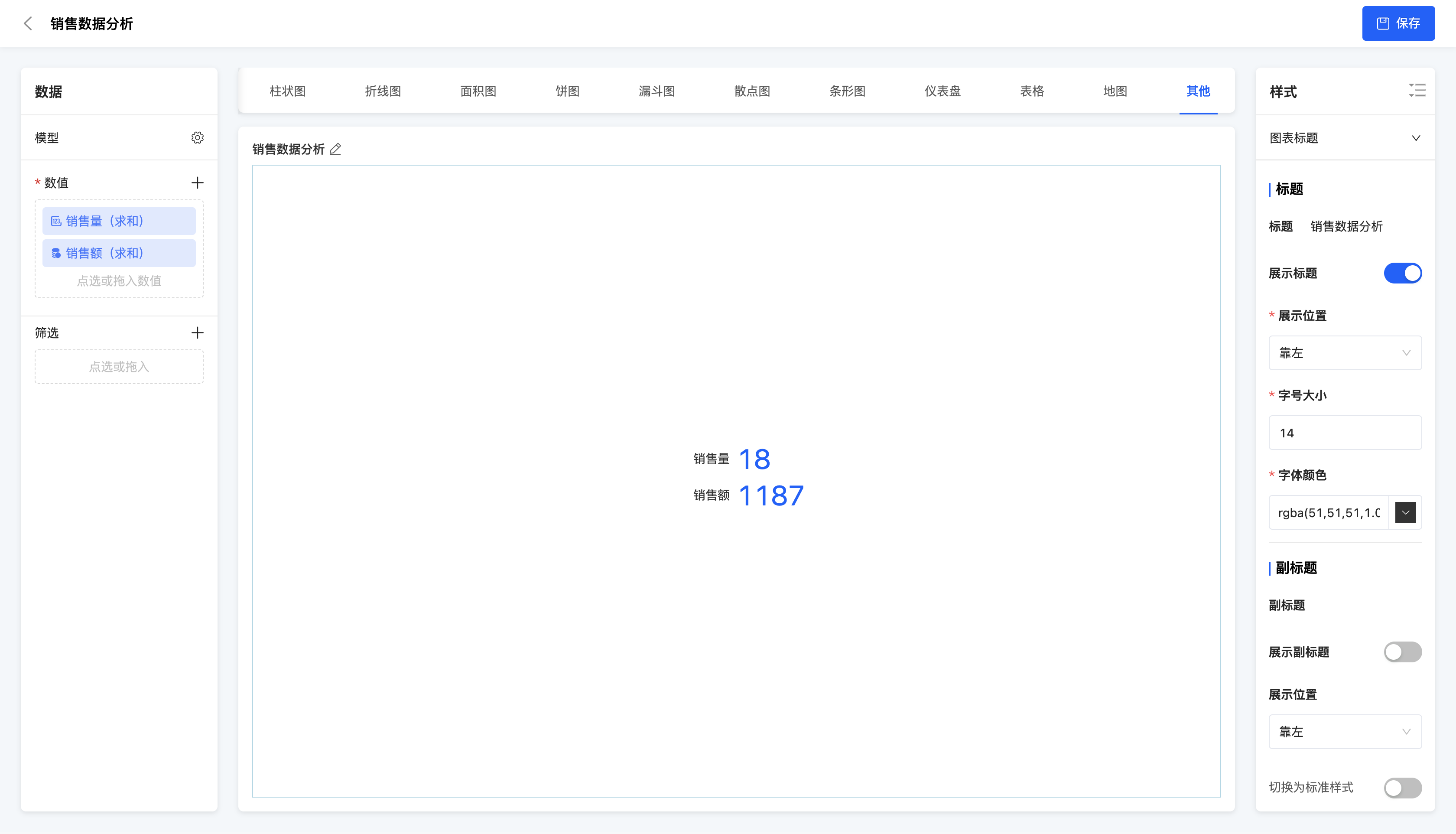 - 数据格式:标准数值 / 千分位 / 百分比 / 自定义单位