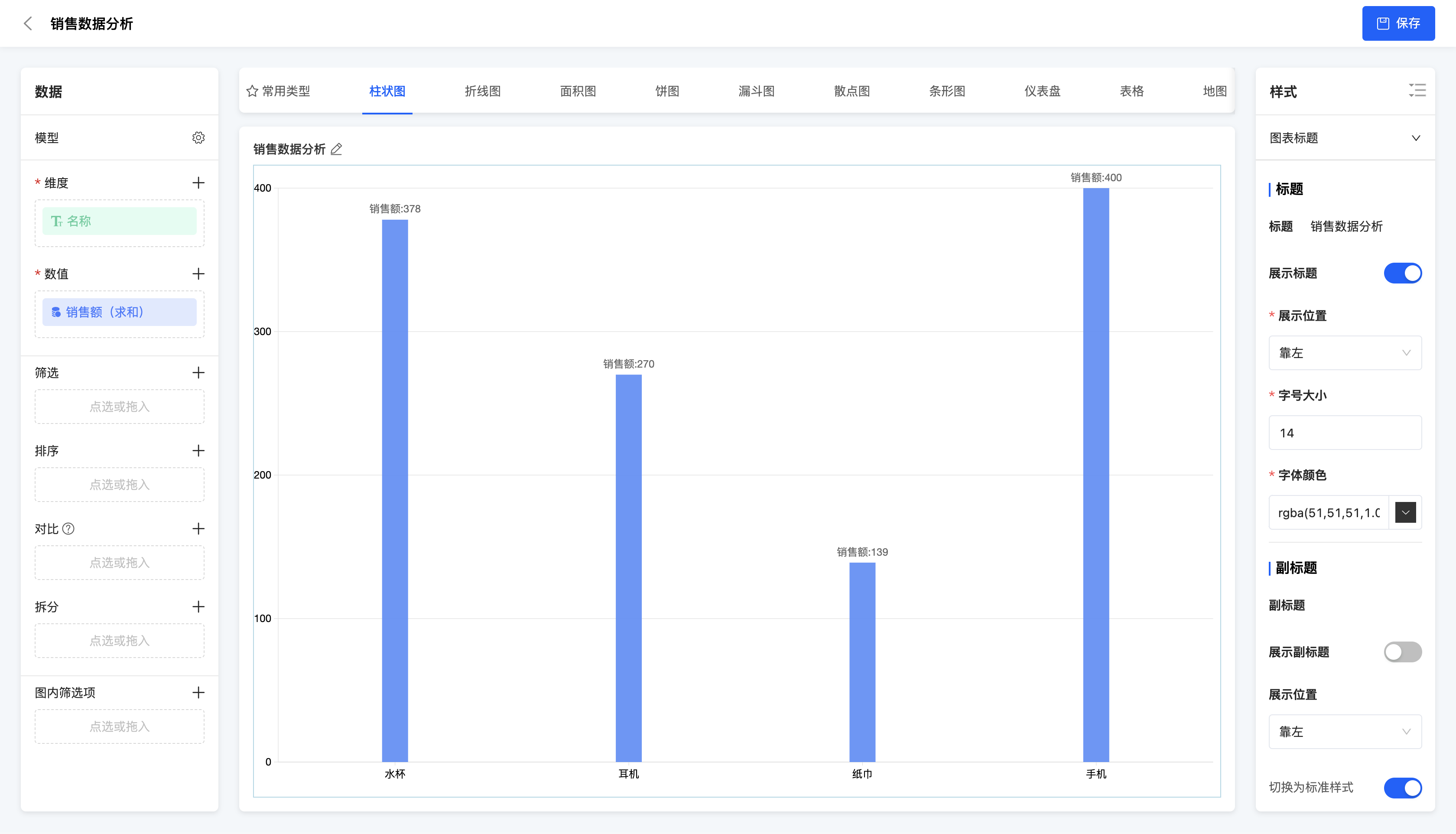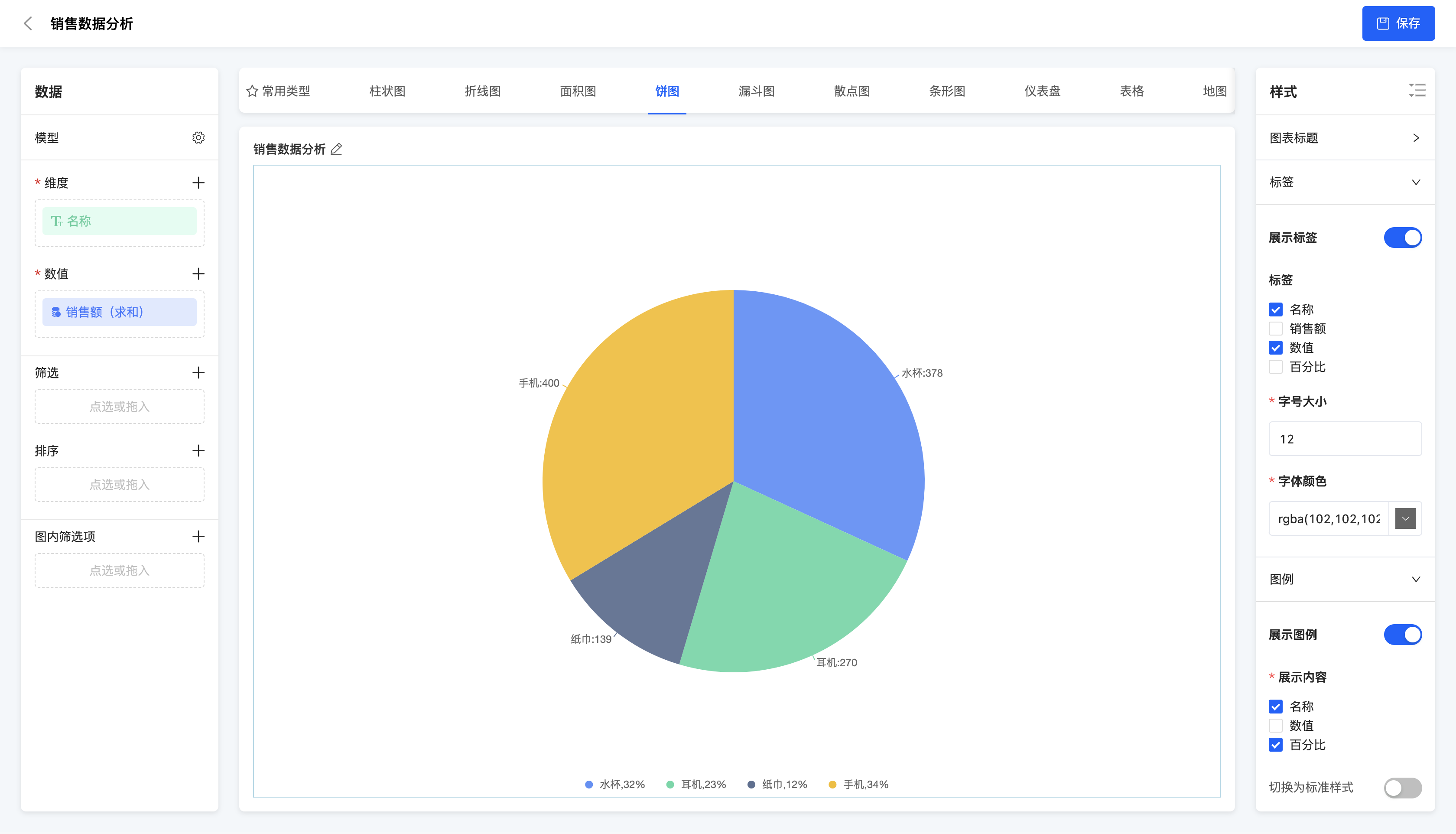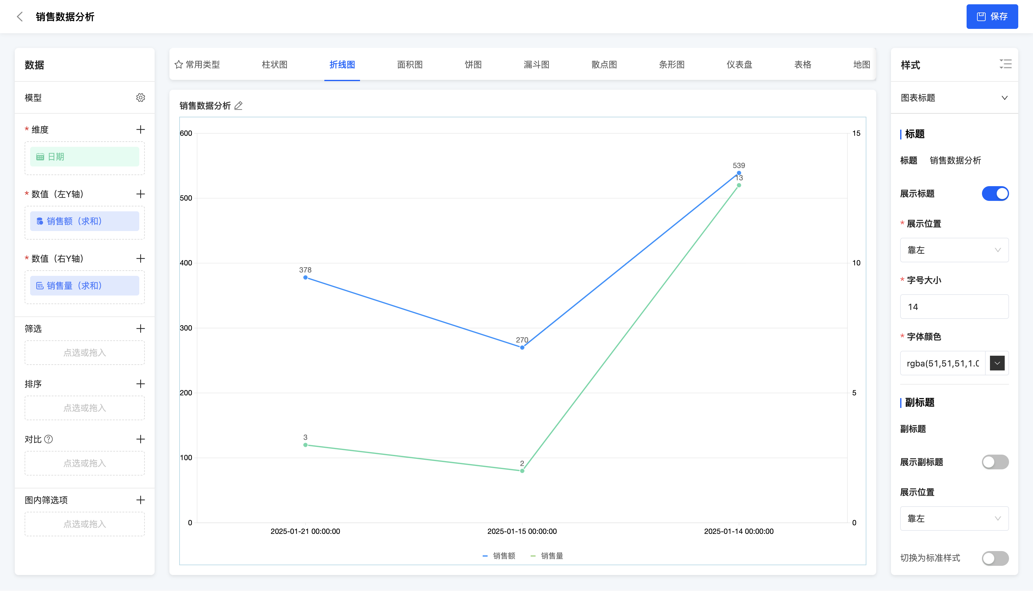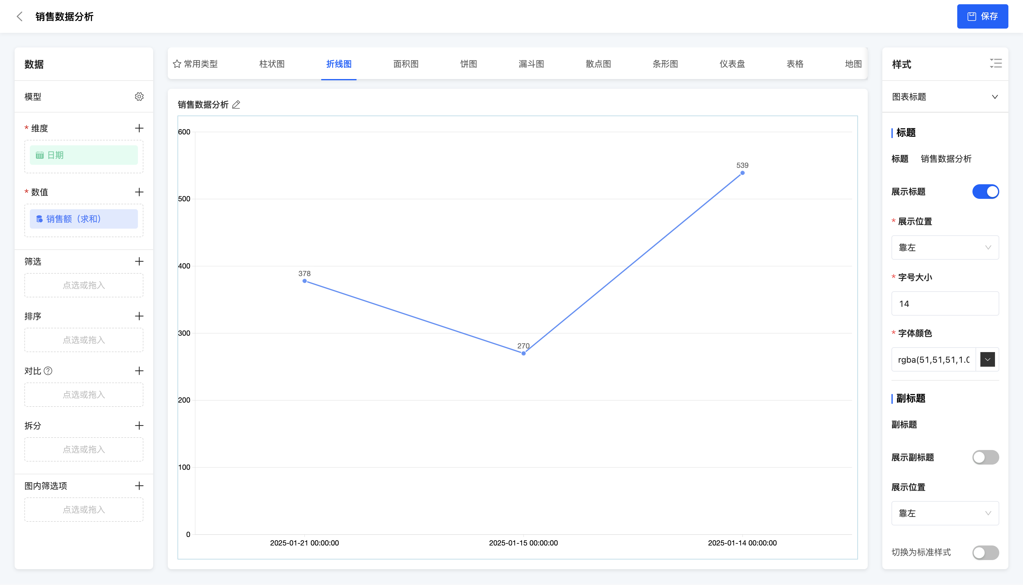 - 数据格式:标准数值 / 千分位 / 百分比 / 自定义单位