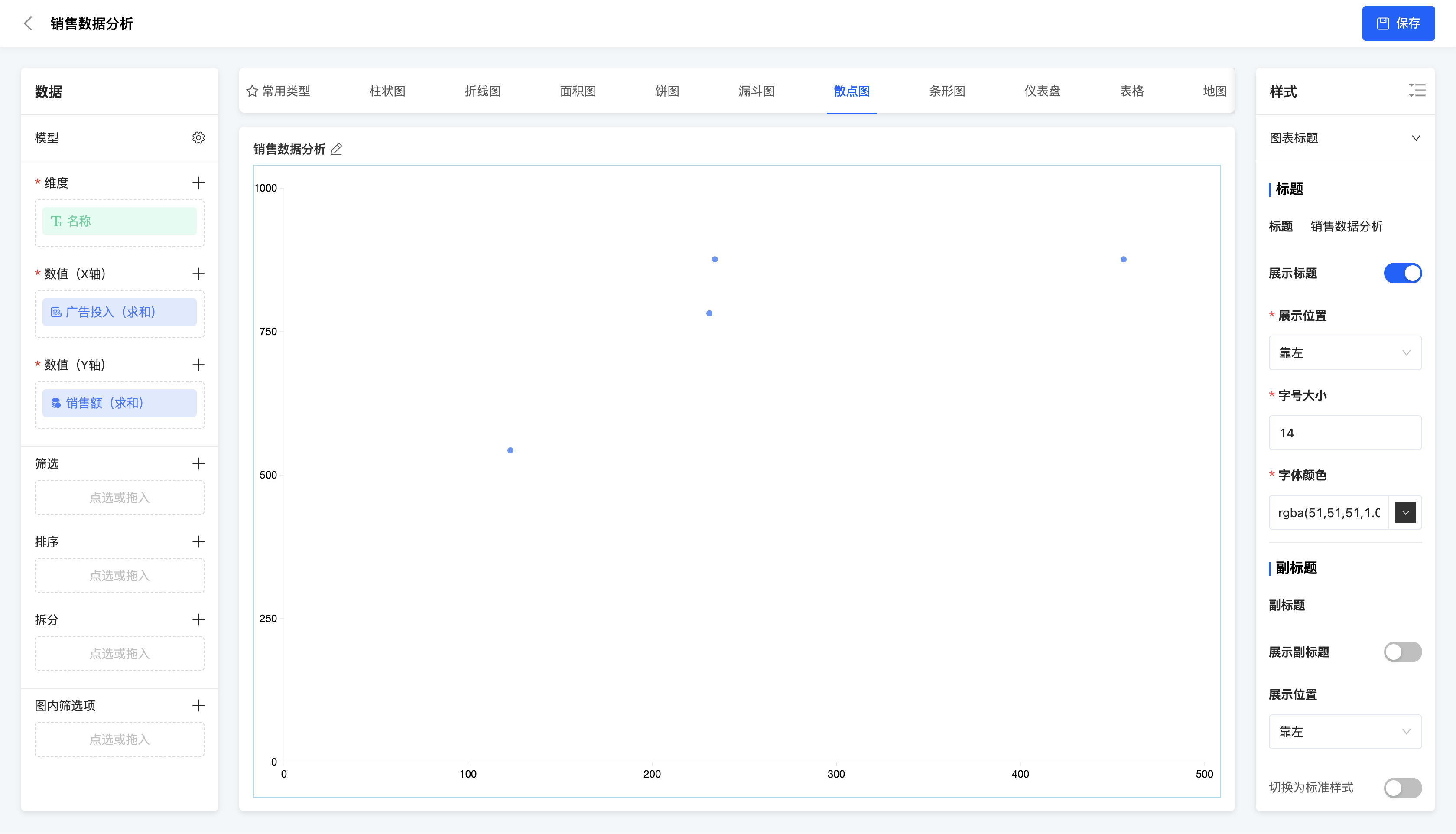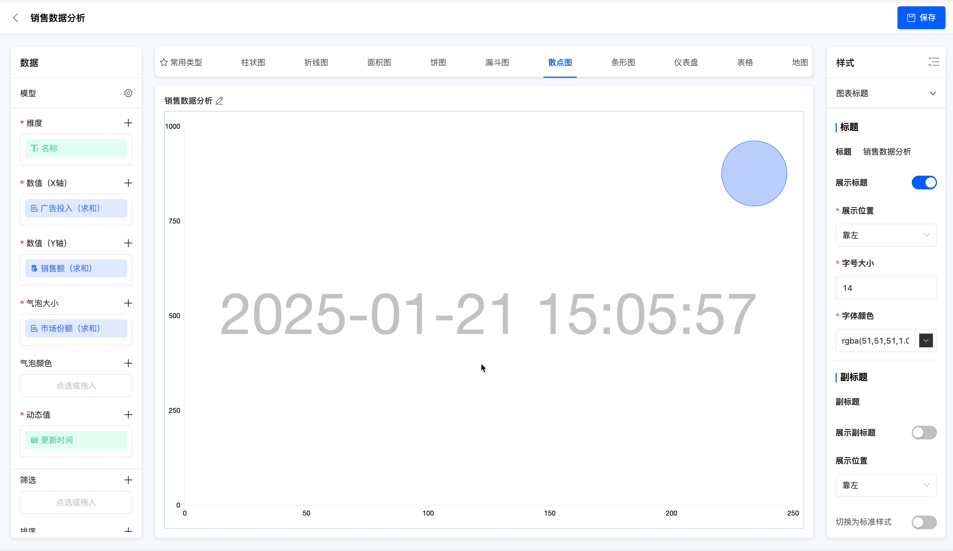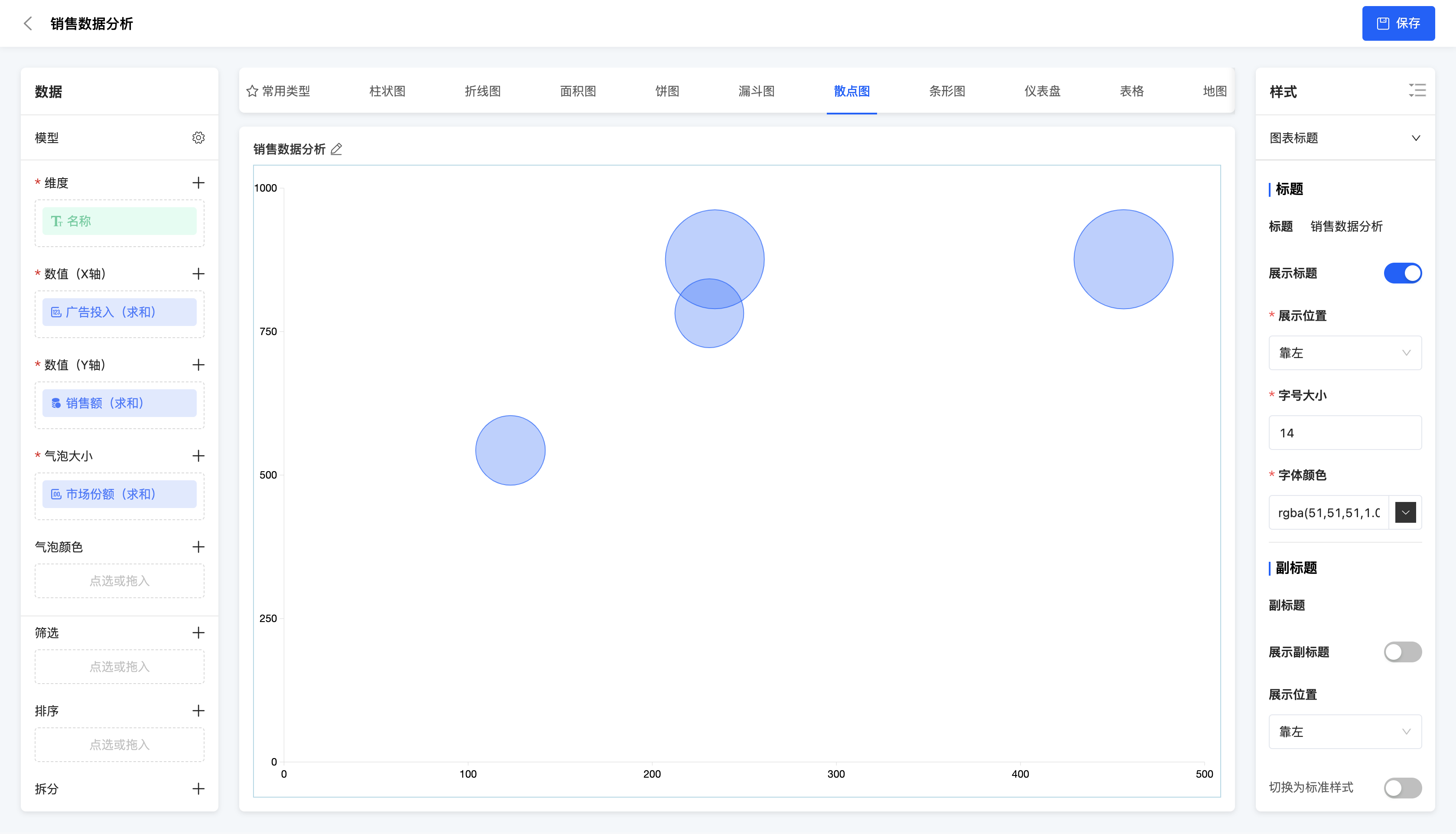 - 数据配置——气泡大小:仅限选择数值,表示该数值的大小