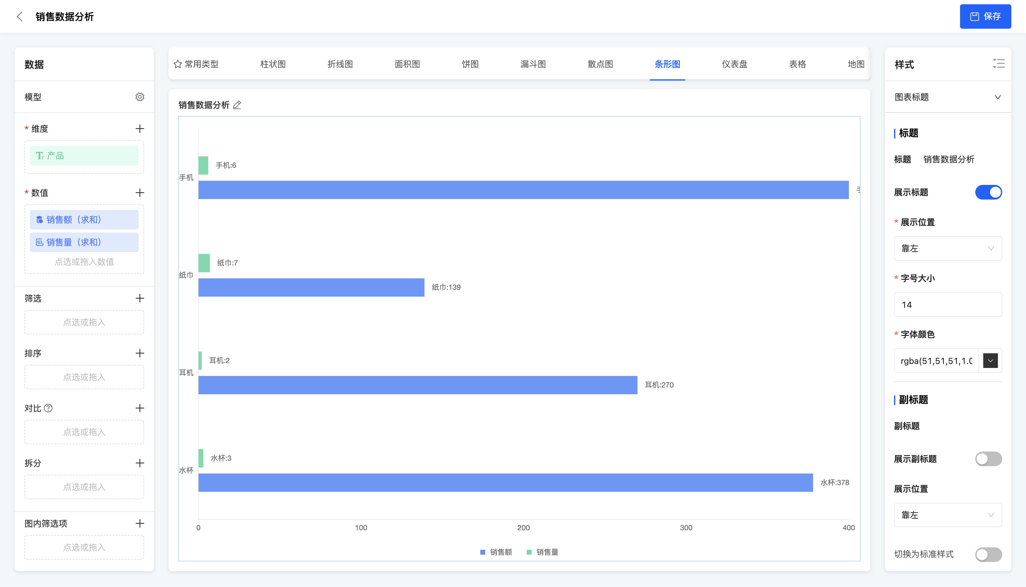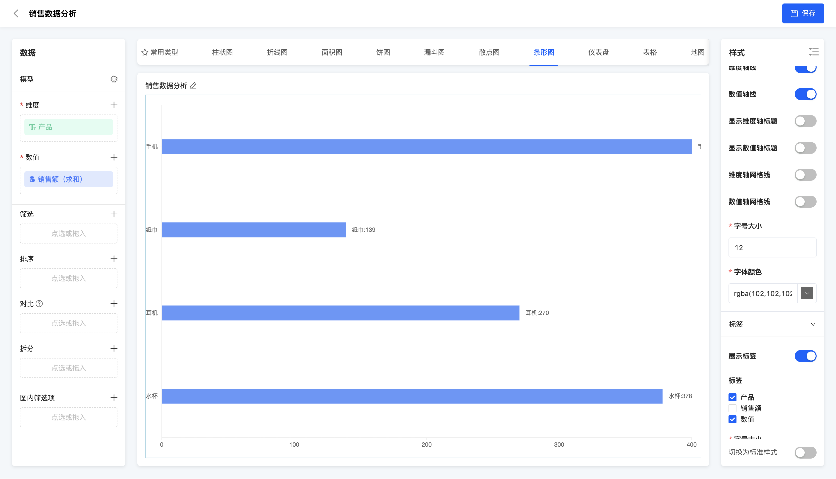 基础条形图是用条形表示数据点的图表类型,与柱状图相似但方向不同。适用于展示各类别的数据对比,如不同产品的销售量对比。