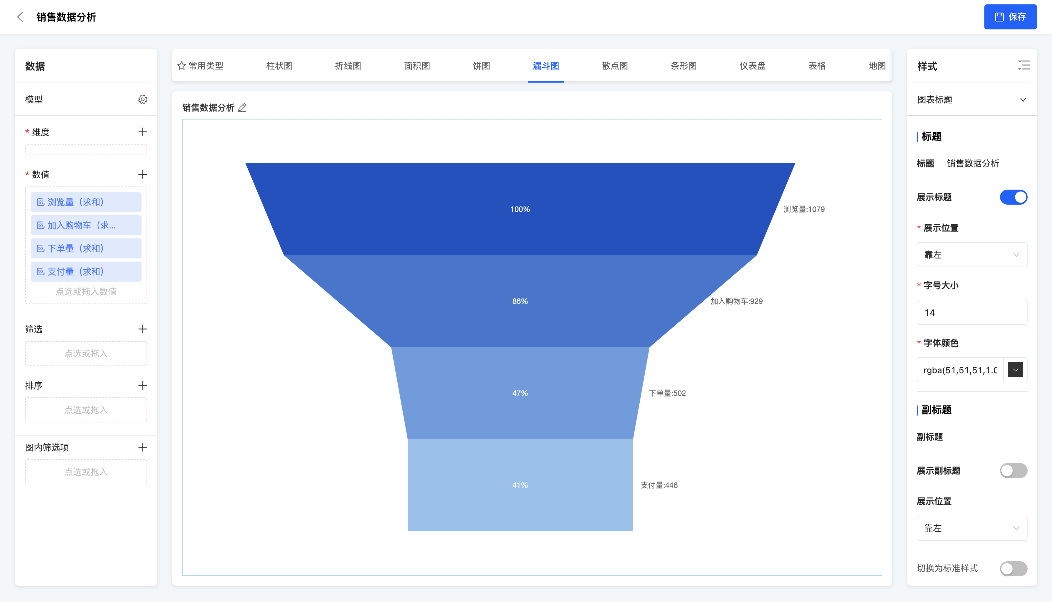 漏斗图是用梯形或三角形表示数据流转过程的图表类型,通常用于展示转化率或流失率。适用于分析业务流程中的转化情况,如用户注册、购买等流程的转化率分析。