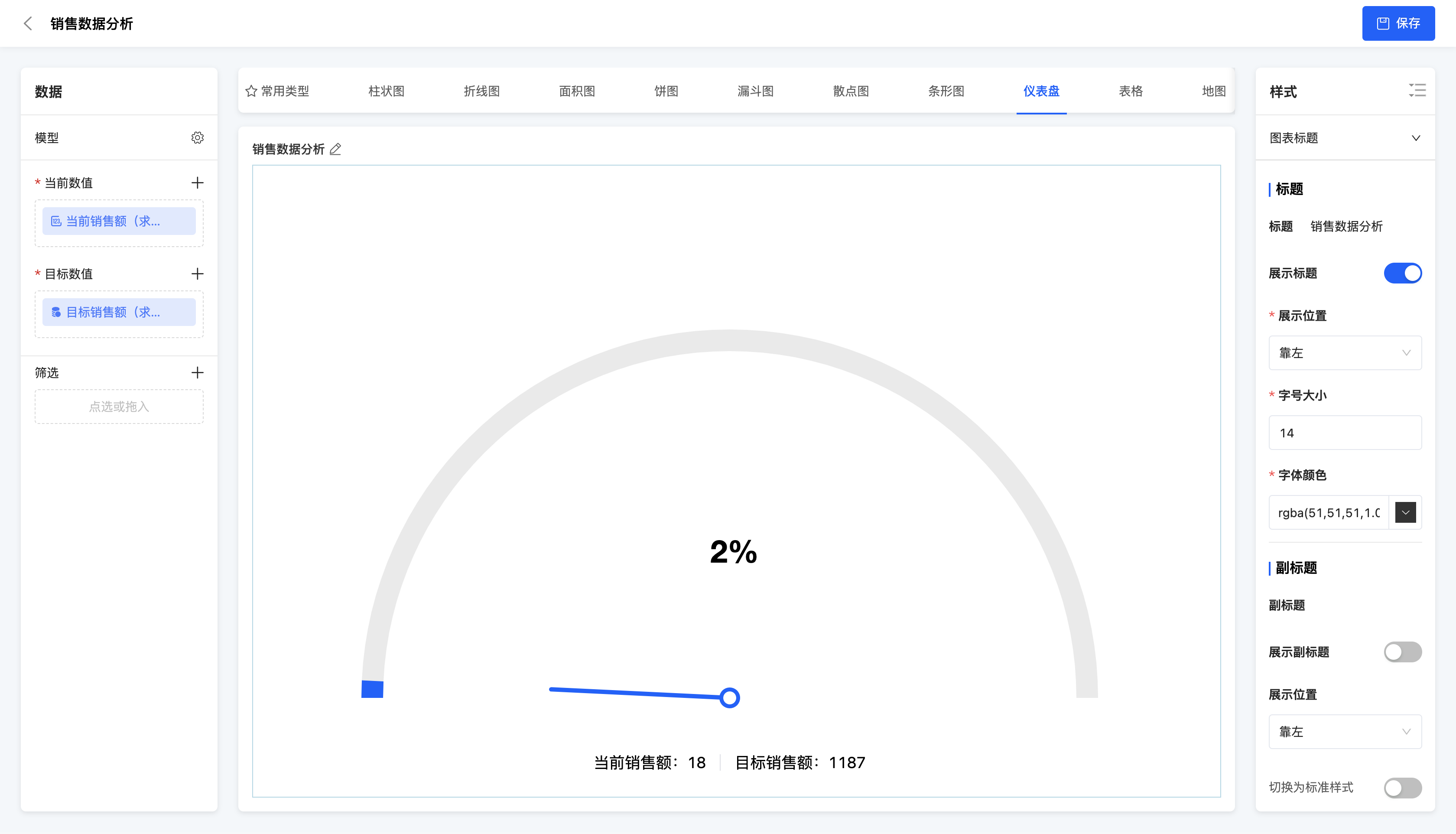 - 样式——颜色设置:可为仪表盘的当前数值和目标数值自定义颜色。