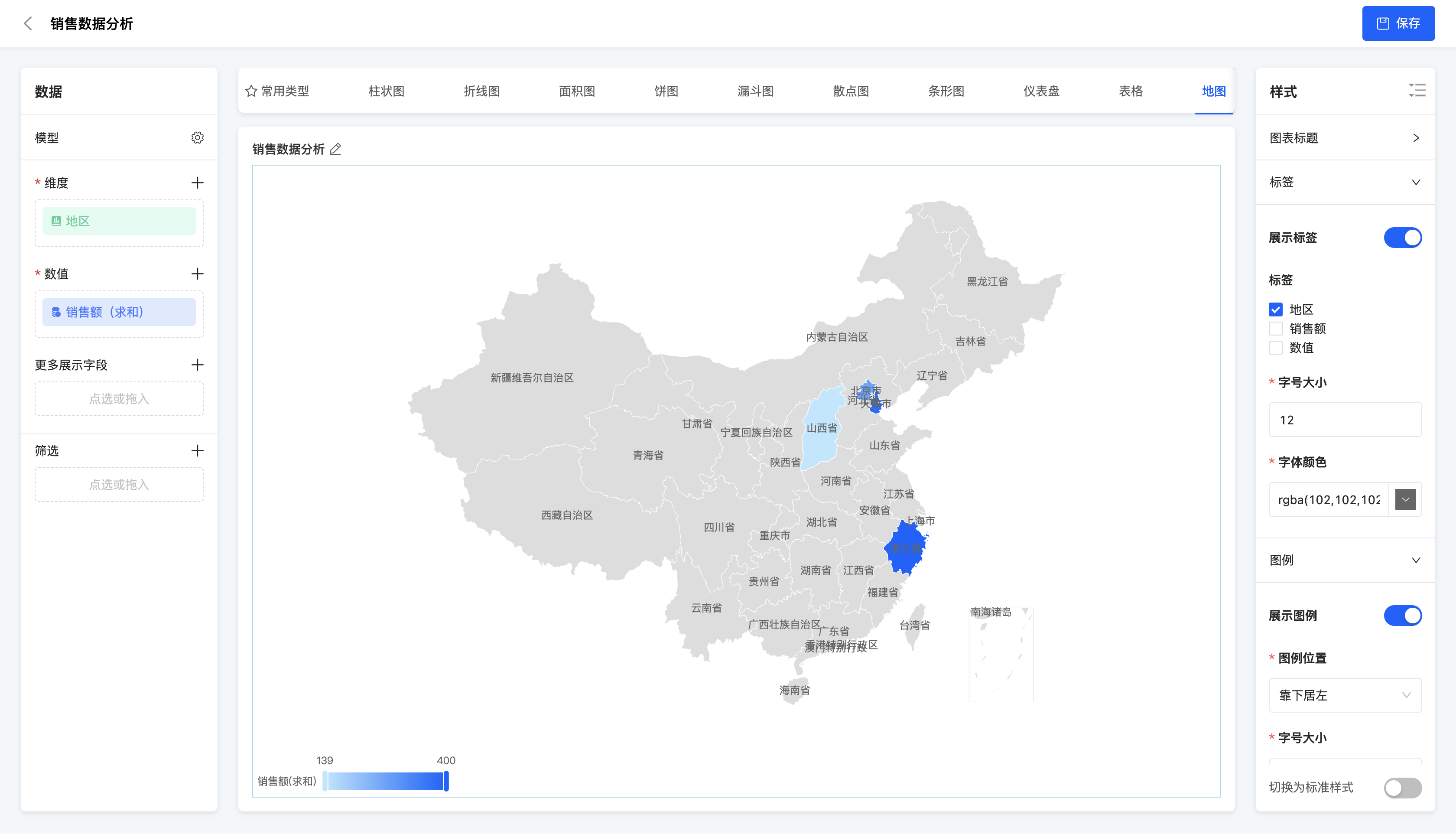 中国地图是用地图形式展示中国各地区数据的图表类型。 适用于展示中国各地区的数据分布情况,如各省的销售额、人口数量等。