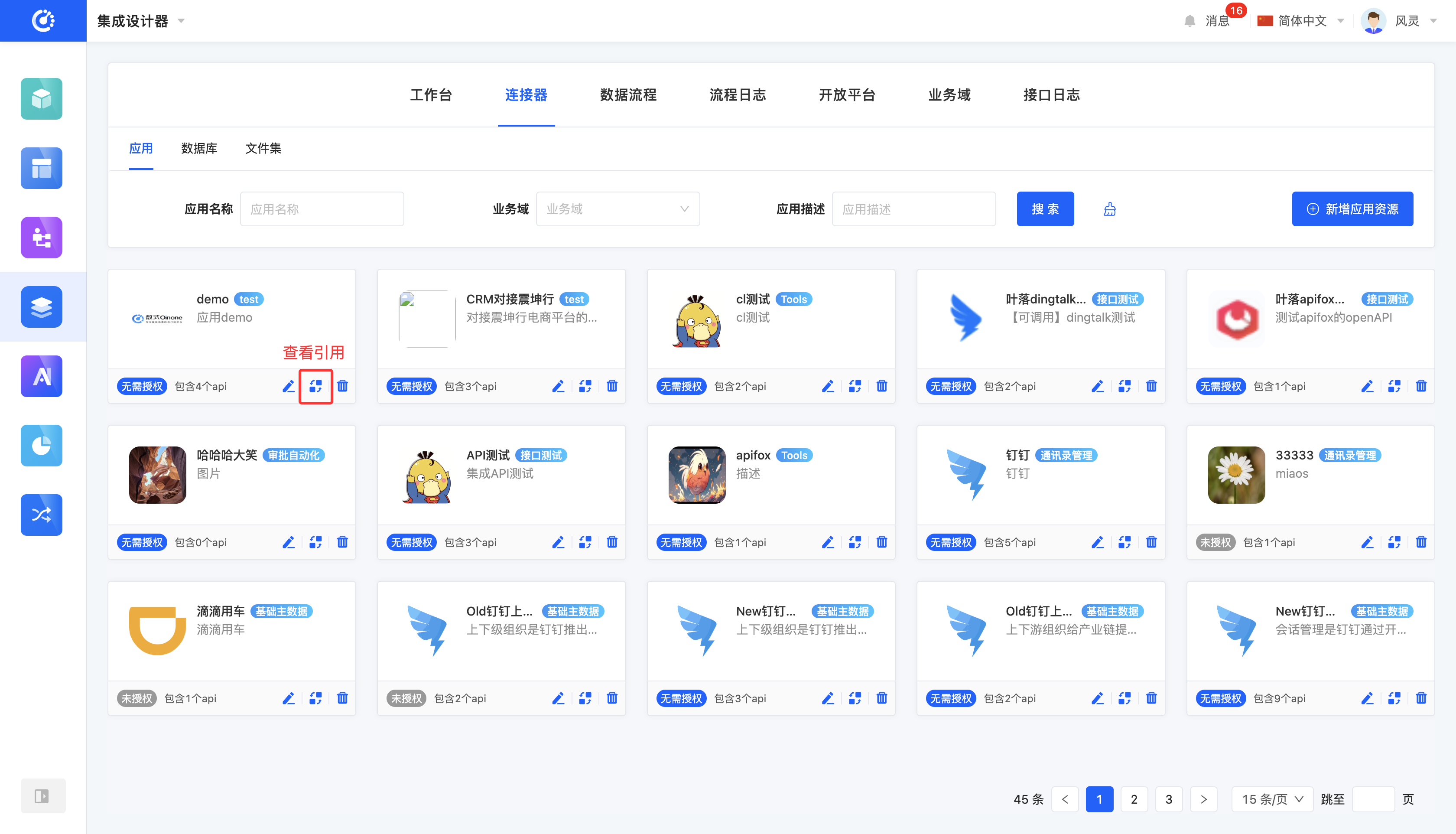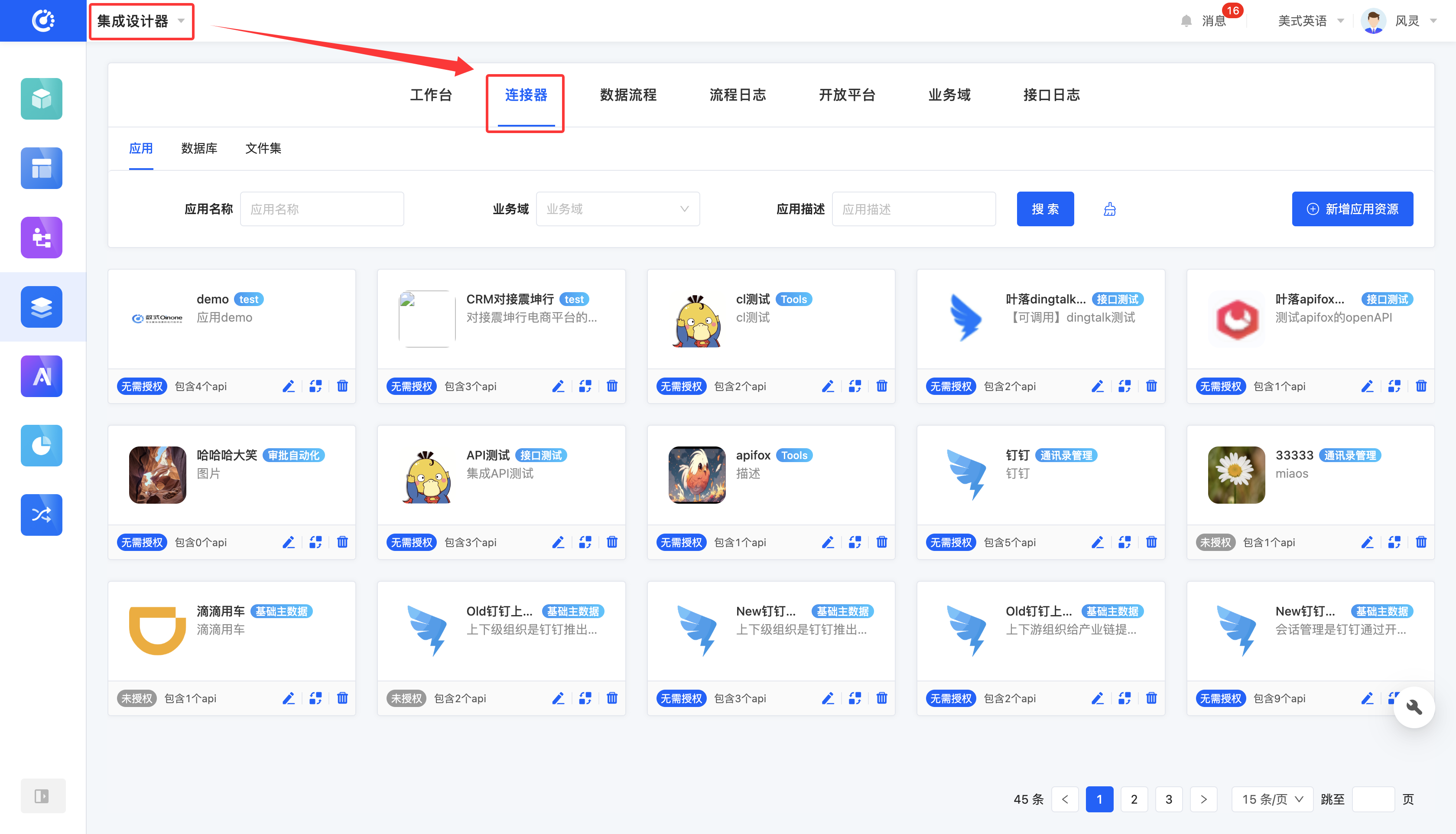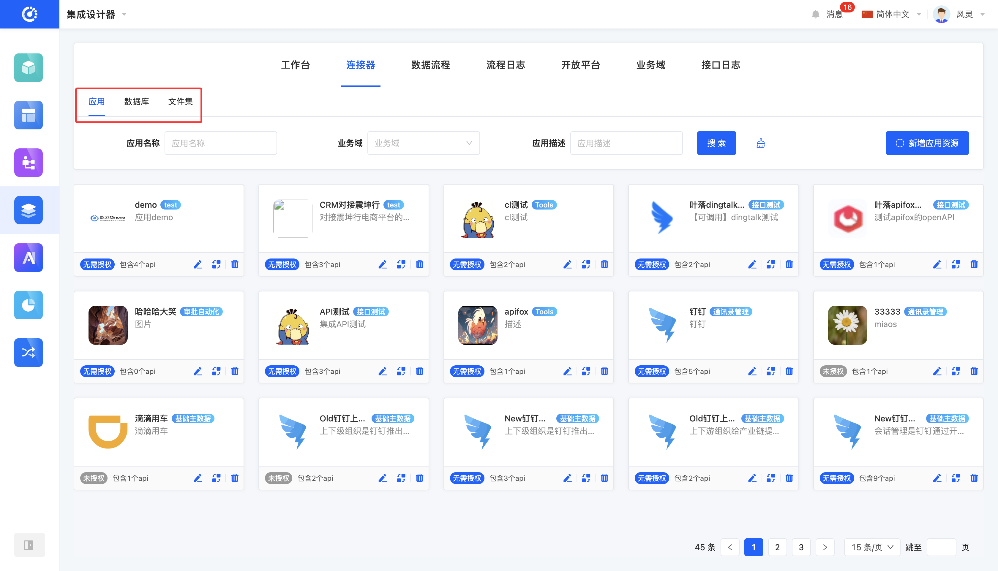 所谓集成,是指平台应用与外部系统之间的对接,而平台内部应用之间则通过内部服务调用直接实现交互。连接器作为集成的重要组成部分,涵盖了应用、数据库与文件集三大类型资源: