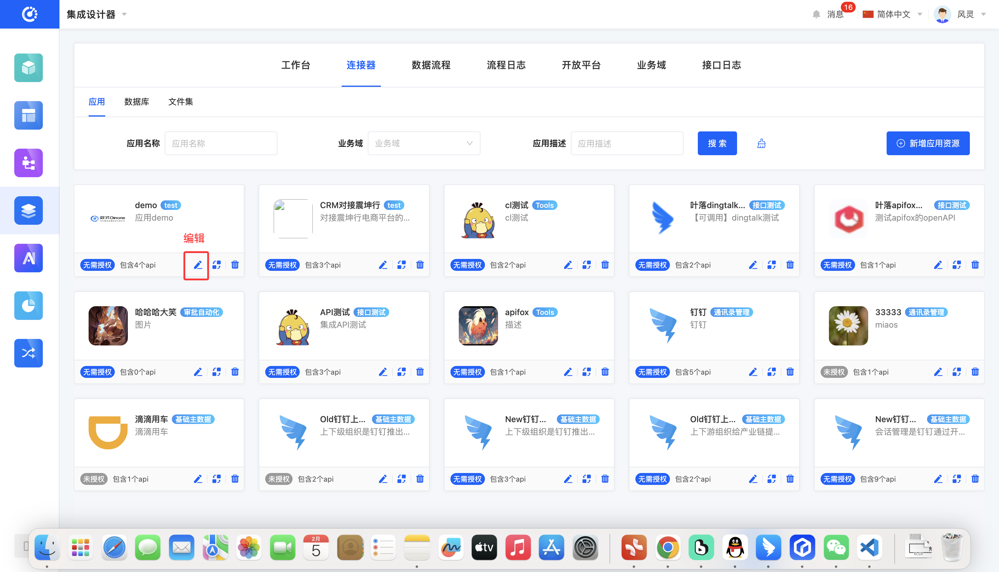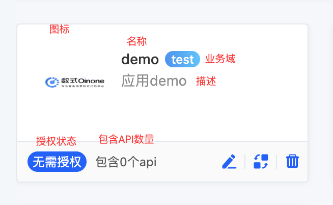 - 应用:图标、名称、业务域、描述、授权状态、包含API数量