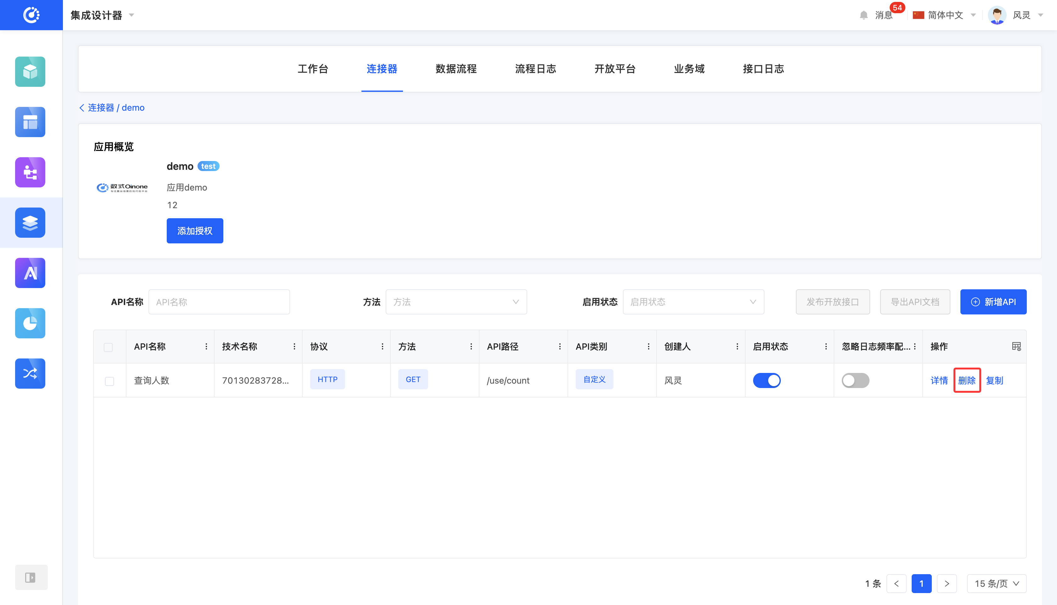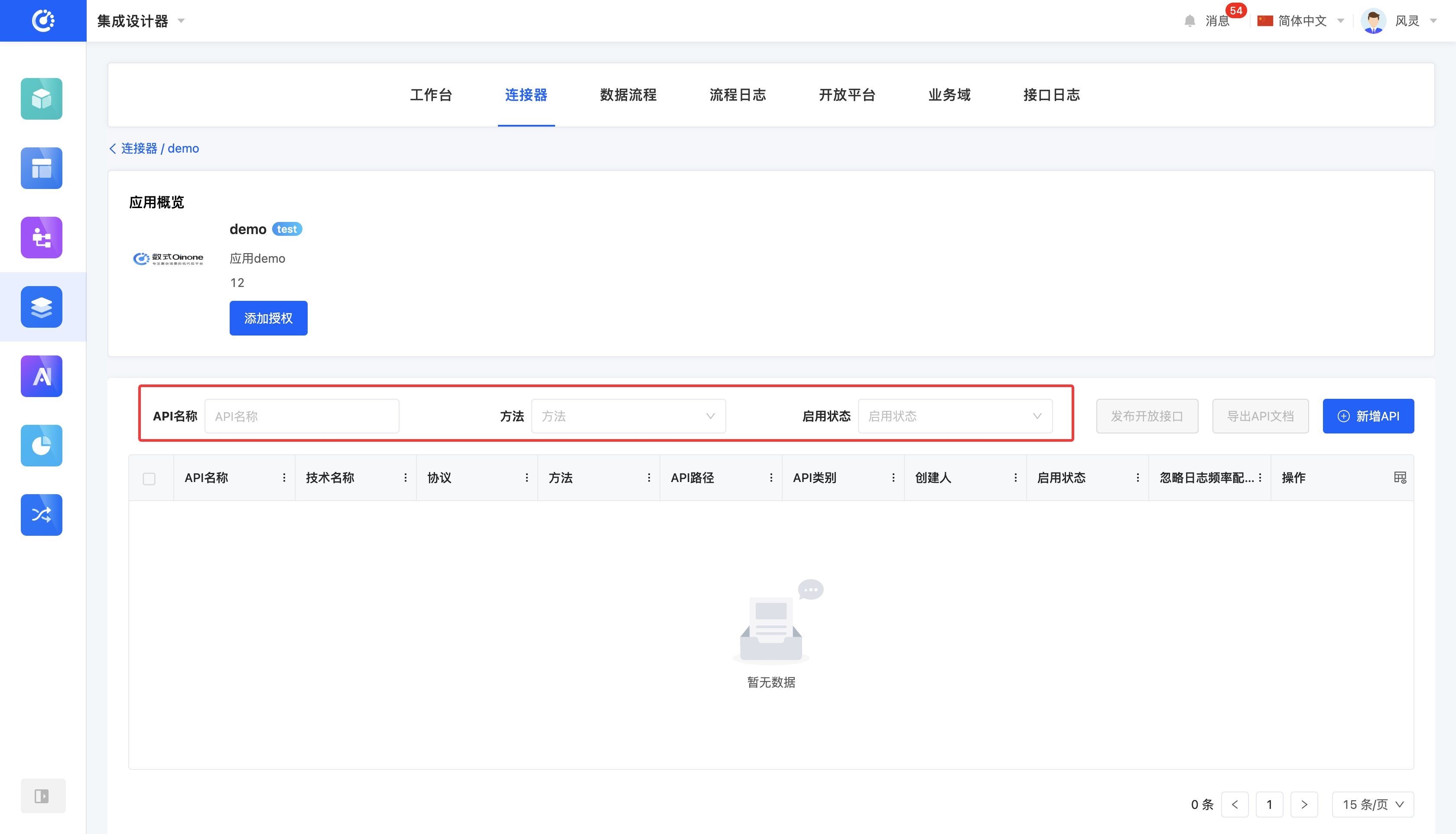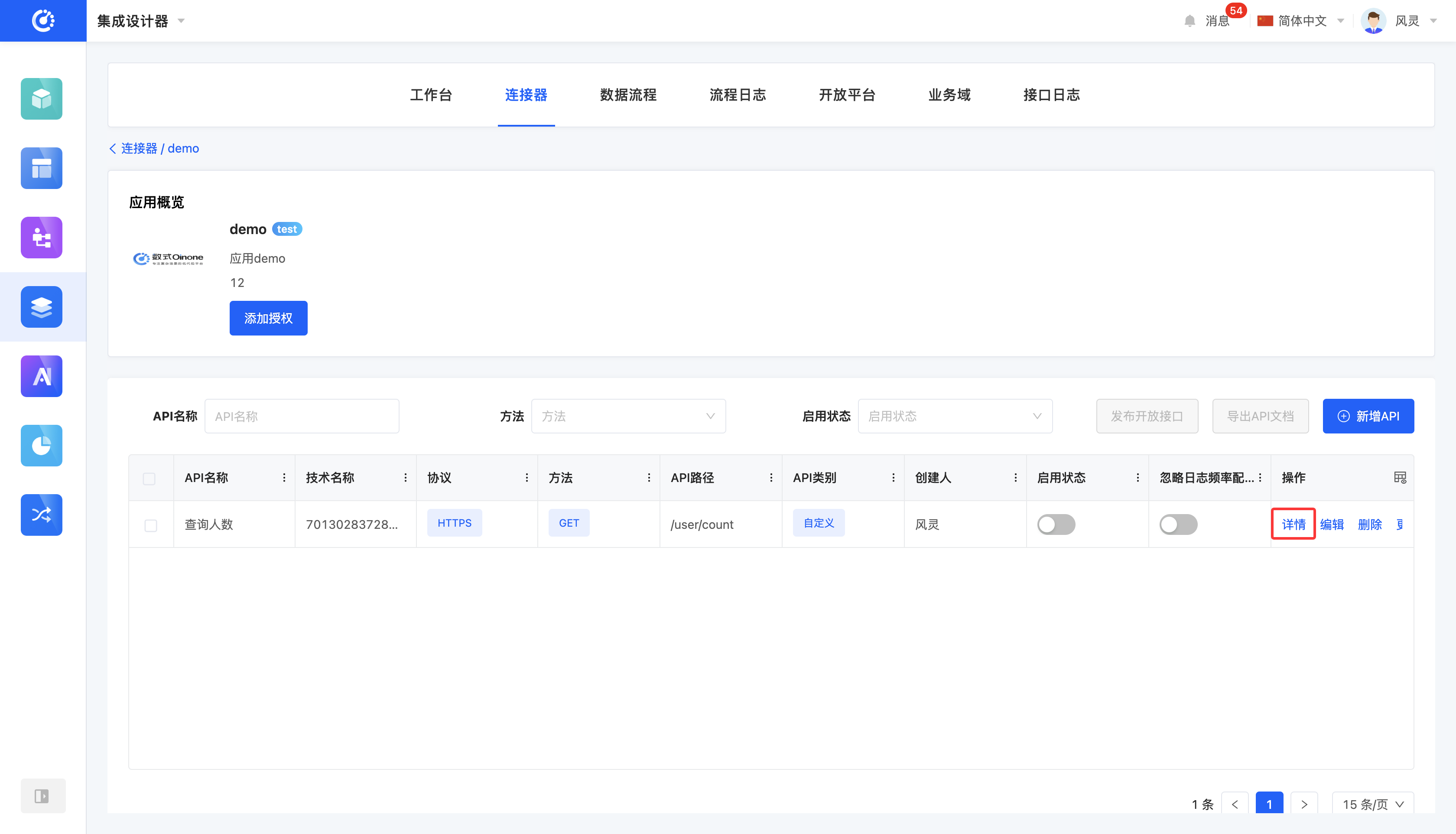 除此之外,无论是 API 还是数据库接口,都可以在【集成应用 → 集成接口】中直接进行测试,从而实现接口调试与应用集成的无缝衔接。