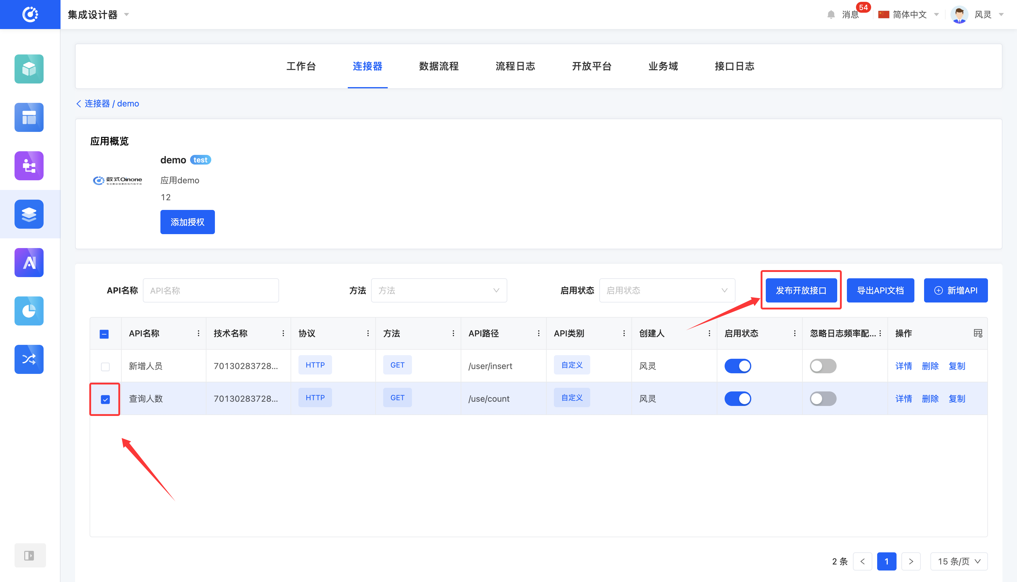 支持将应用与数据库中的API发布为开放接口,设置为开放接口后可被外部系统使用。