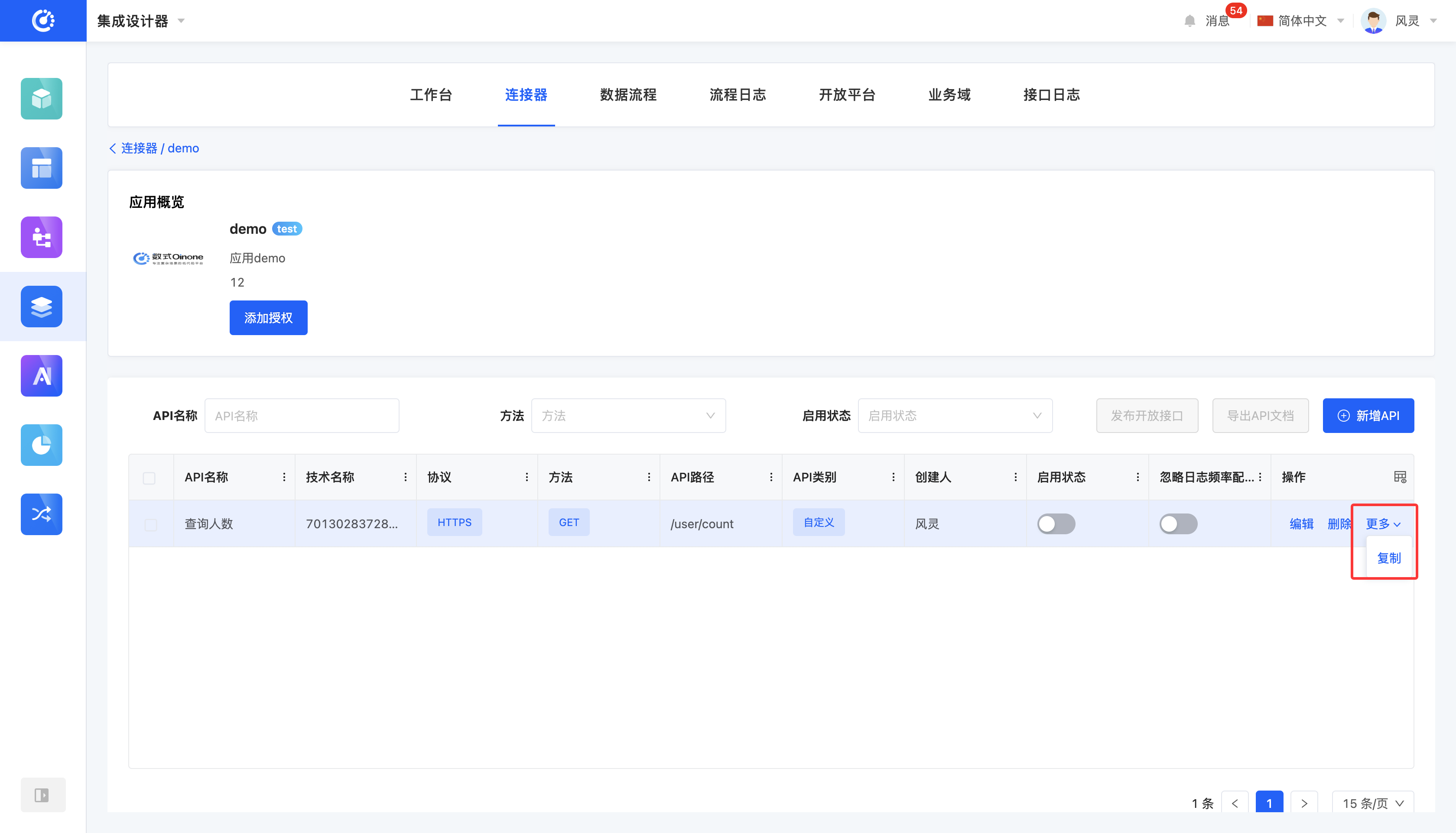 当API未启用时,操作栏会呈现“编辑”按钮,“复制”会被收至“更多”中