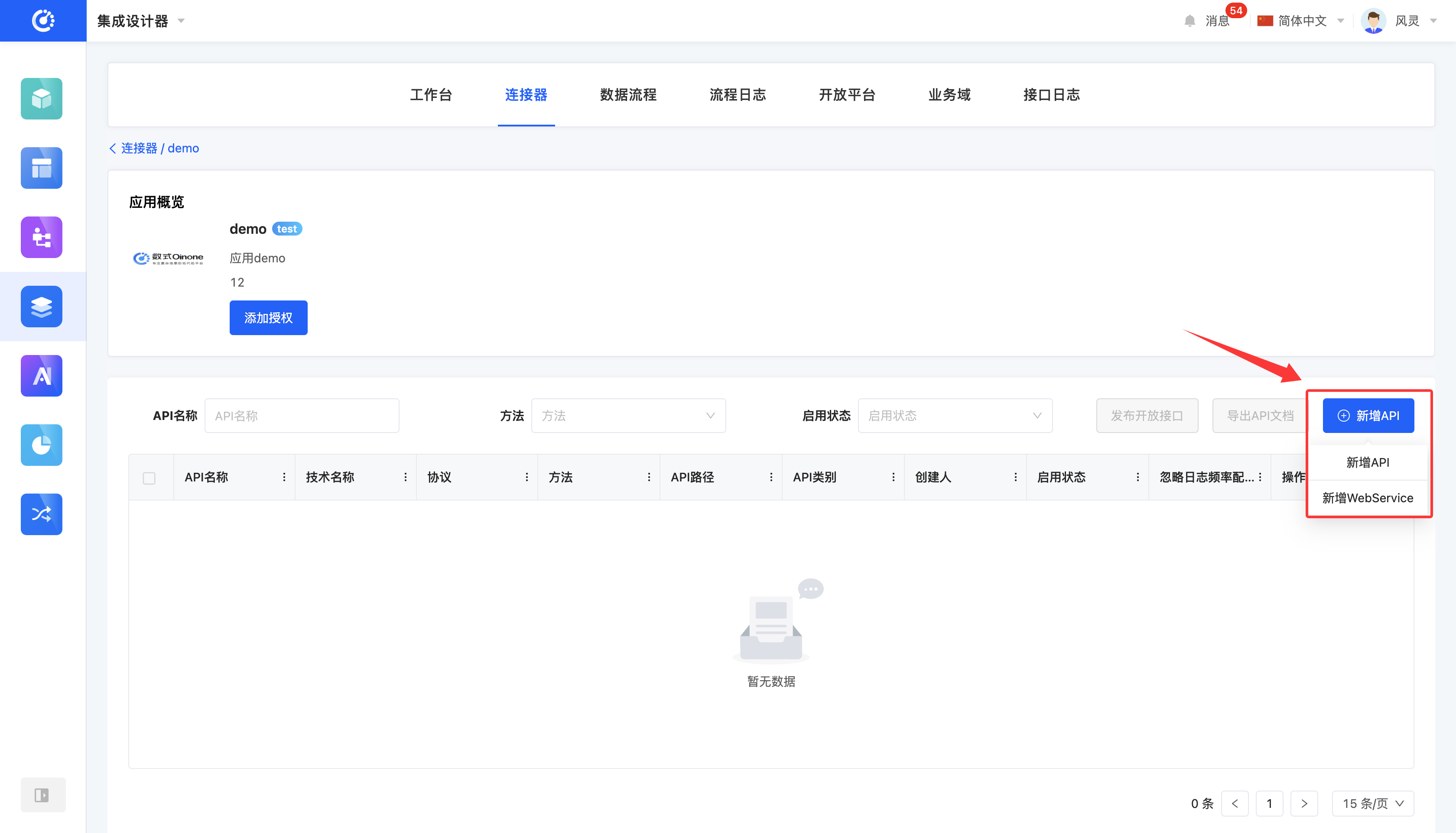 应用可依据业务需求新增API或WebService,数据库可新增API,文件集可新增文件