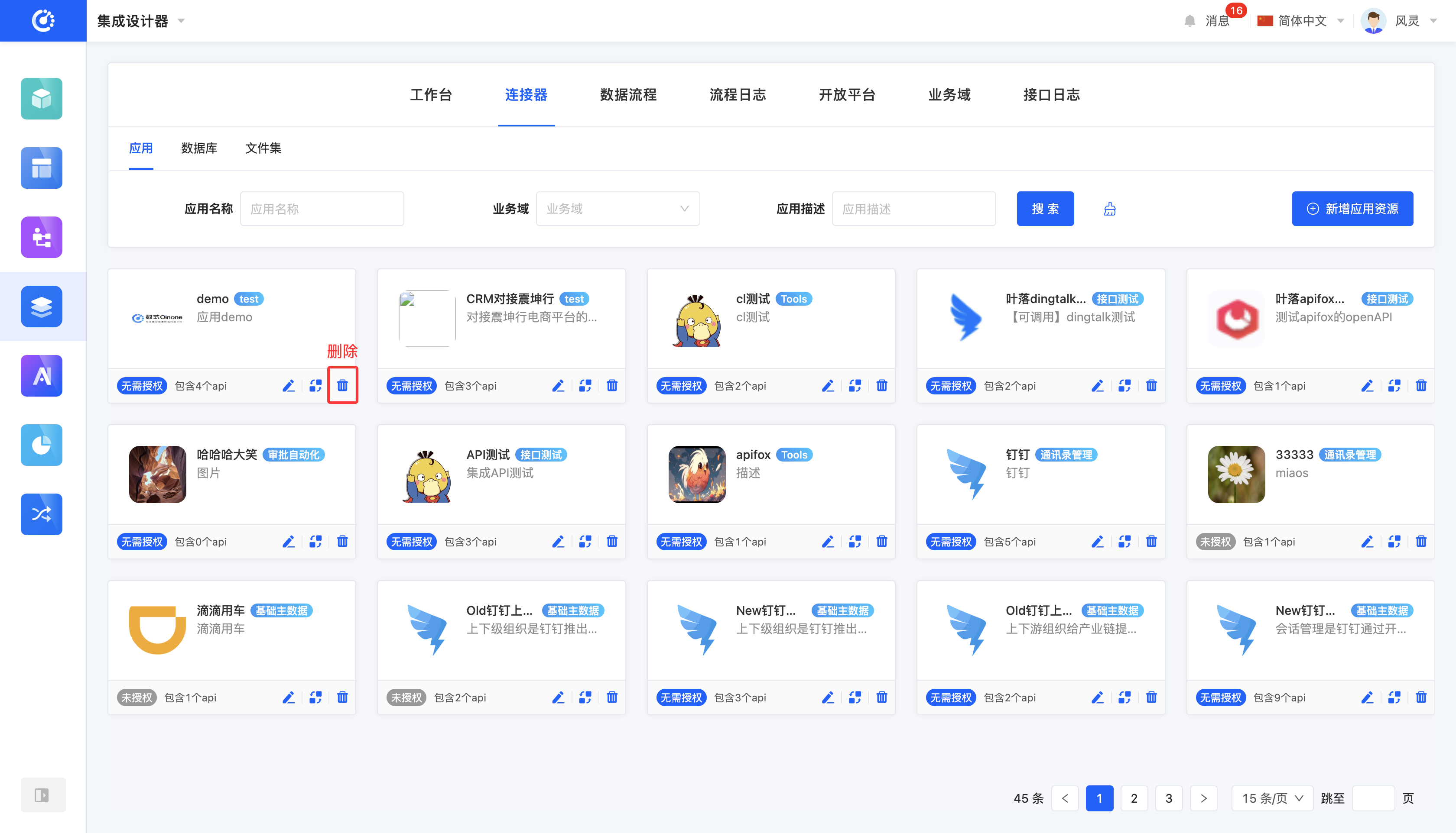 点击「删除」图标,确定删除后即可删除。(此处展示应用,数据库与文件集同理)