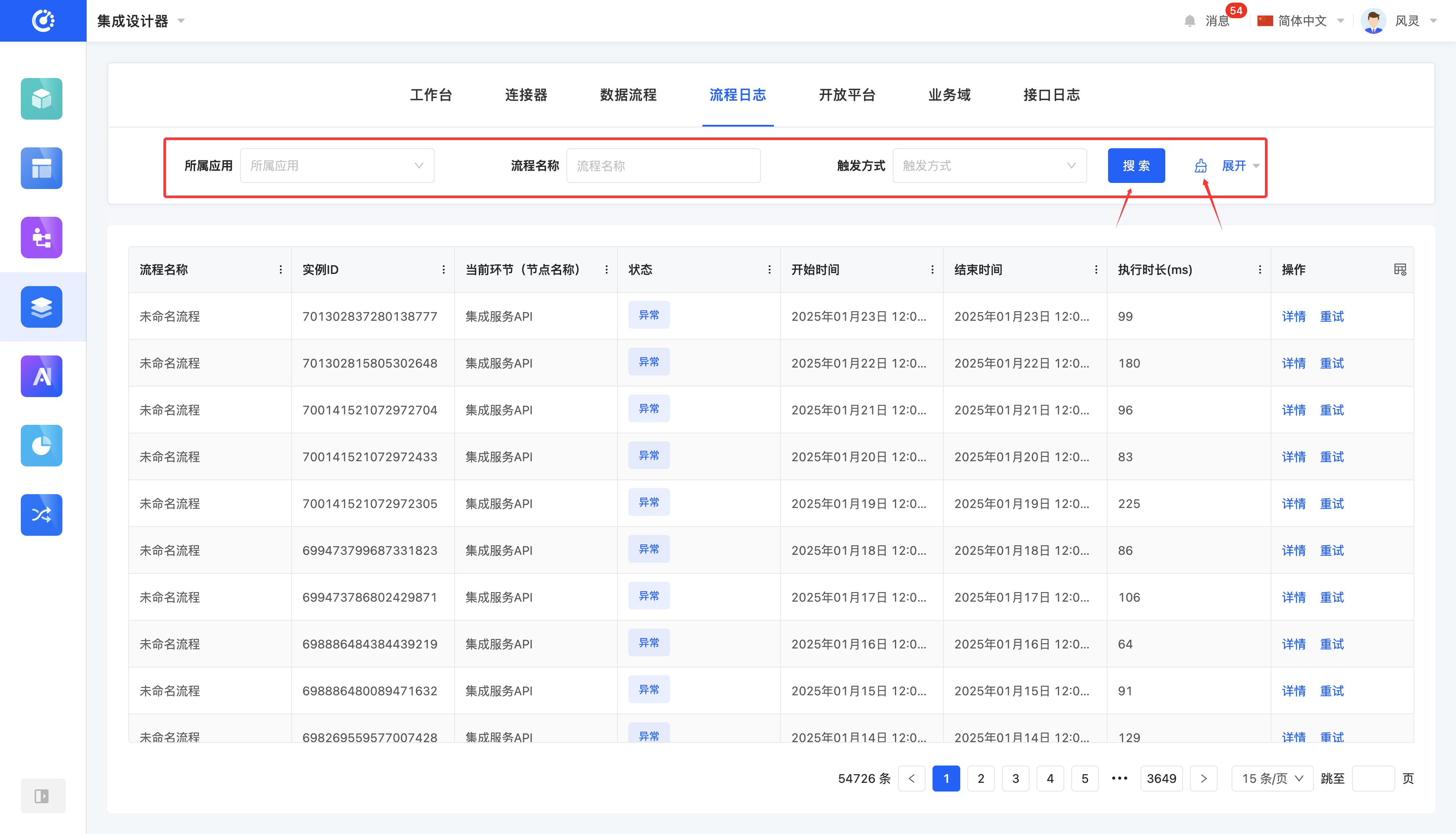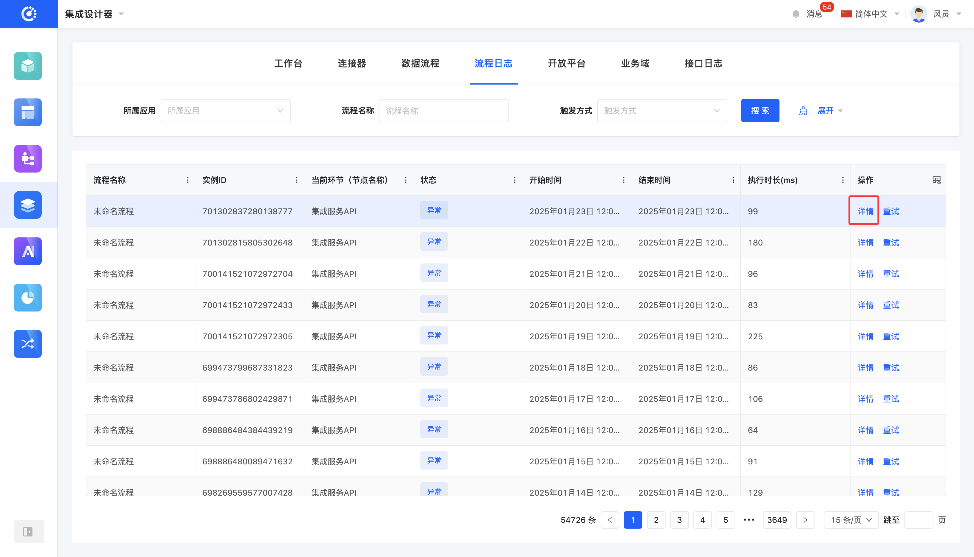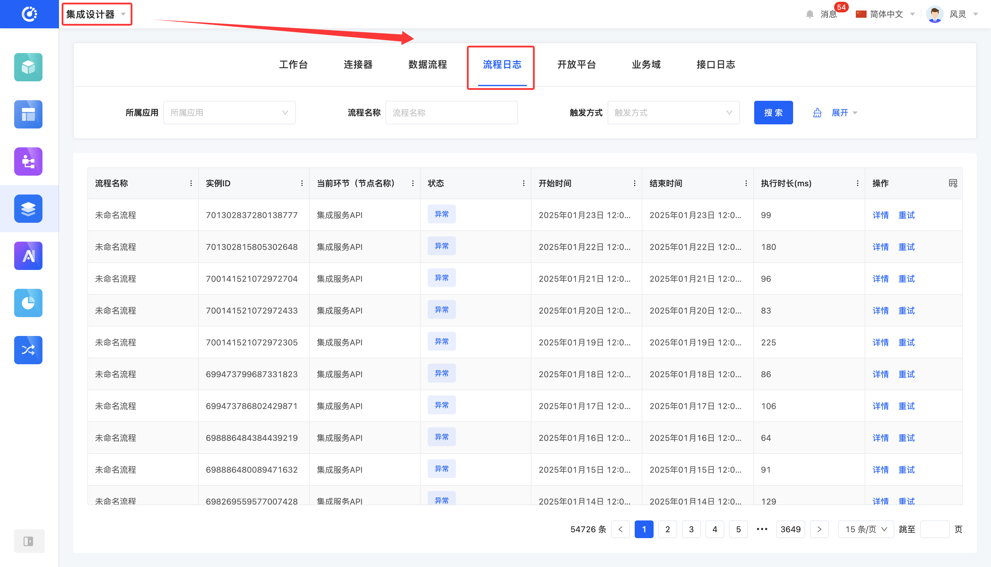 流程日志用于详细记录数据流程的执行情况,每当数据流程执行一次,系统都会在流程日志中保存一次相应的执行记录。