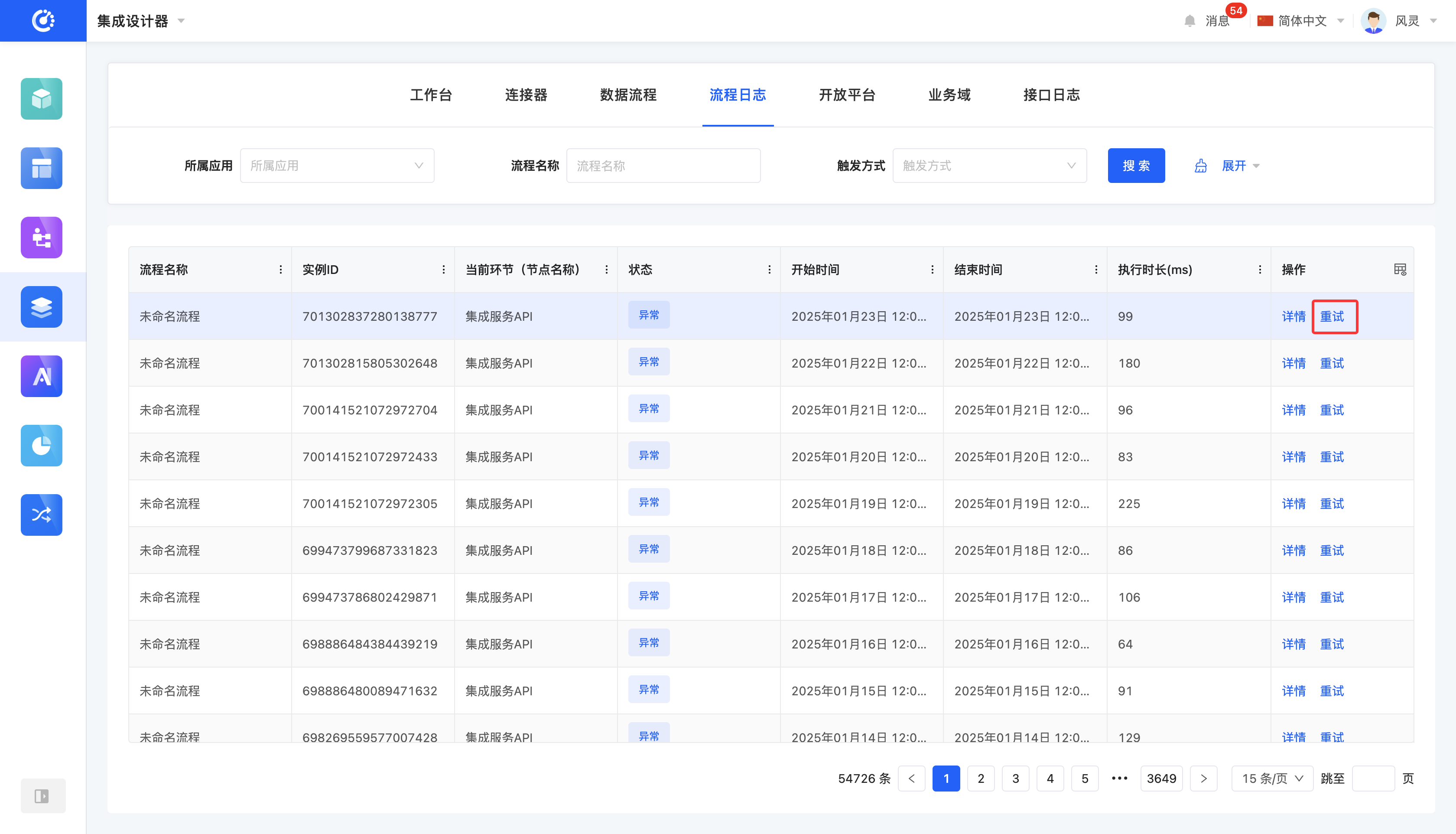 点击「重试」,即可重新执行数据流程