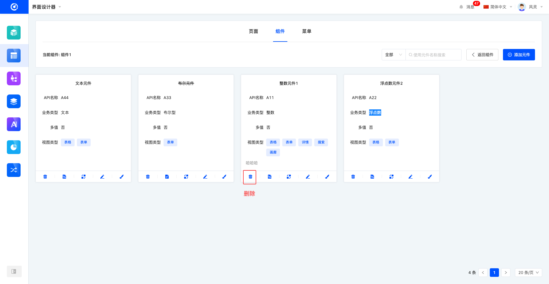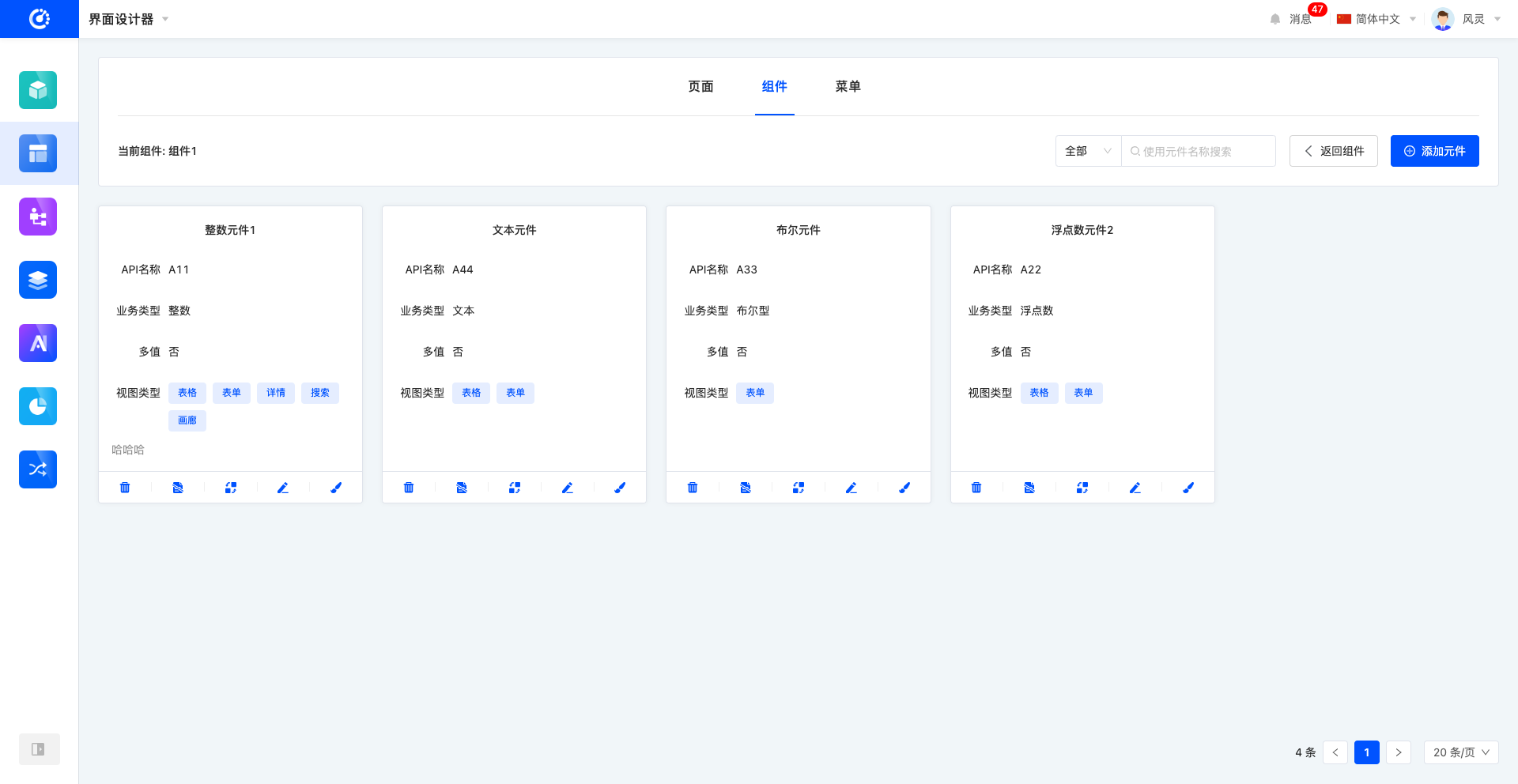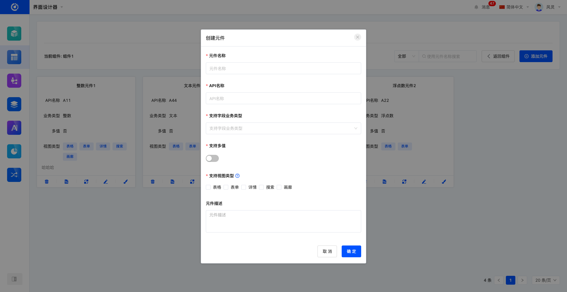 在页面设计器中,元件默认以卡片的形式呈现为元件列表,方便用户浏览和选择。元件卡片上展示了元件的基本信息,包括元件名称、API名称、支持字段业务类型、是否支持多值、支持视图类型与元件描述,以便用户快速了解元件的功能和用途。