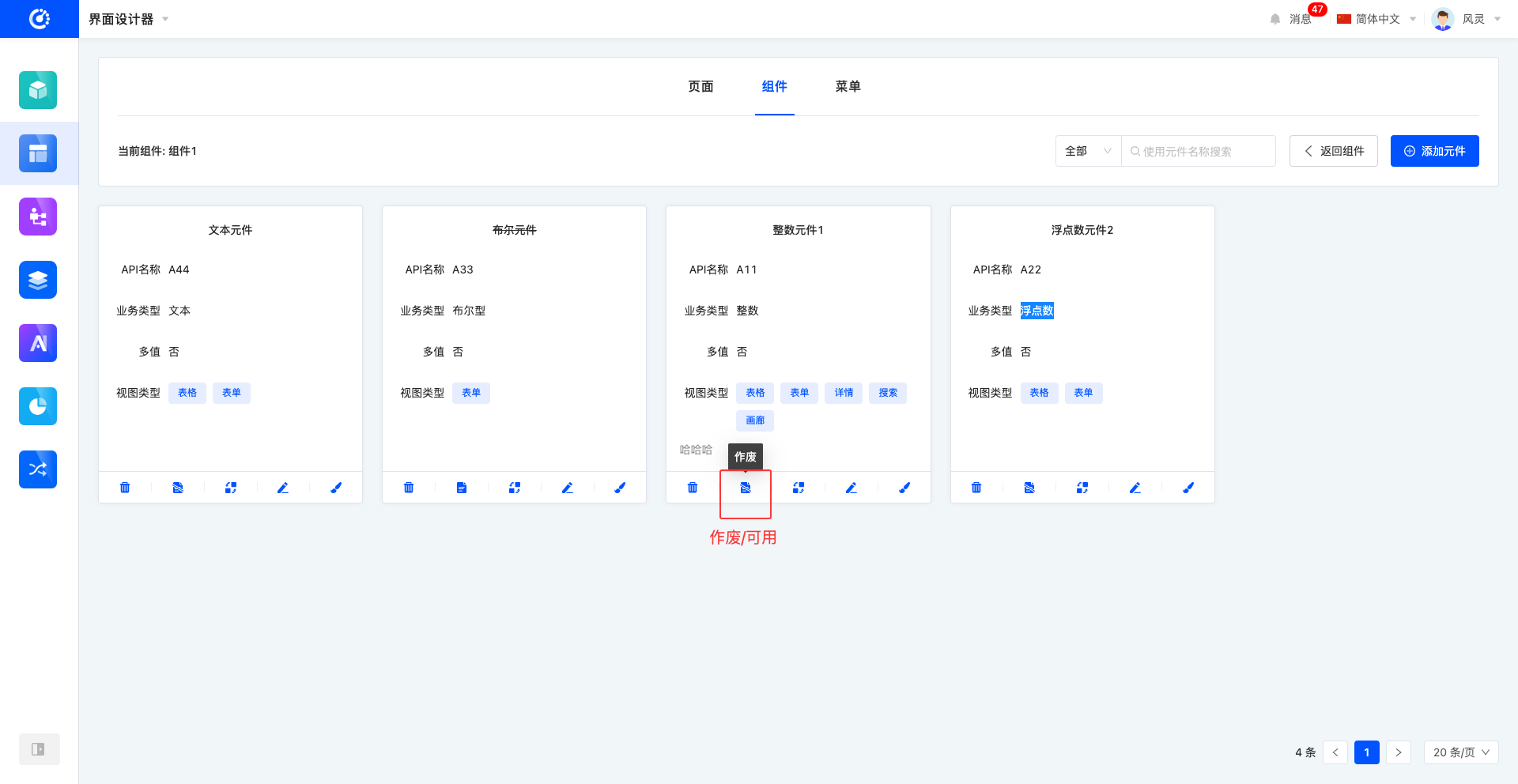 点击「作废」,组件设置为作废状态,按钮变为「可用」;再次点击,元件设置为可见状态。